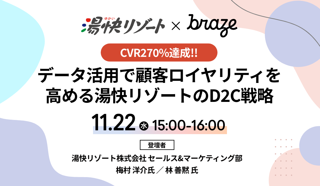 湯快リゾートのセールス&マーケティング部マーケティング課 の梅村氏、林氏をお招きし、B2C企業のマーケティング部門、DX部門、CRM部門の方などを対象に、以下の内容のセミナーを開催いたします。データを活用したマーケティングDX、自社のD2C戦略をどのように進めるべきか、沢山のヒントが得られる内容ですのでぜひご参加ください。