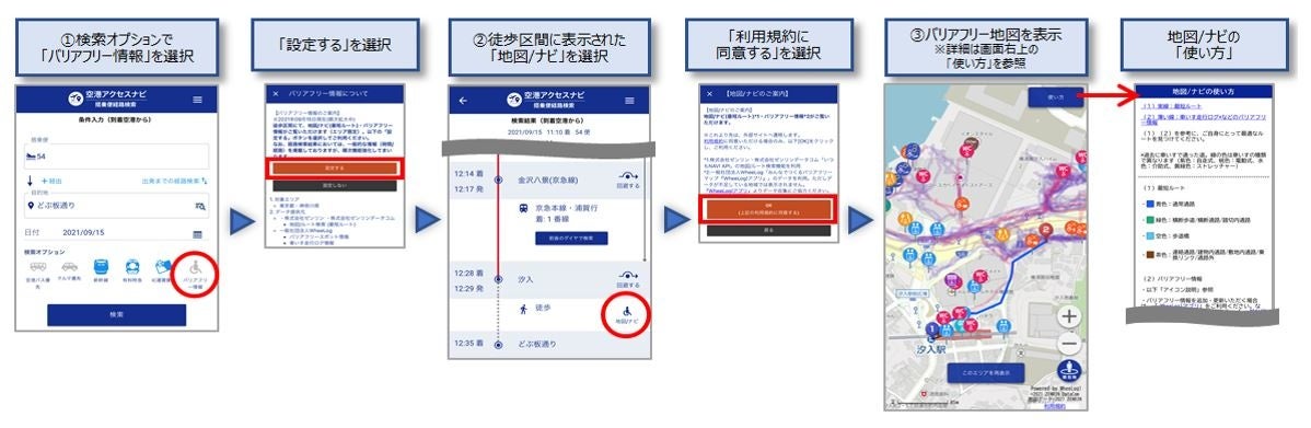 2021年9月より、ANAの経路検索サービス「空港アクセスナビ」の徒歩区間における「バリアフリー地図/ナビ」機能の運用を開始しております。本機能では、車いすで実際に走行したルート・利用したスポットなどの表示を移動参考情報として提供しておりますが、GPSの測位精度の誤差によりルート表示に課題がありました。今後は、正規化データの検証と精度向上を行い、正規化後のルート情報を用いたバリアフリールートのナビ(検索・案内)機能及び地図データの拡充により、車いすユーザー向けルート情報の実現に向け取り組んでまいります。