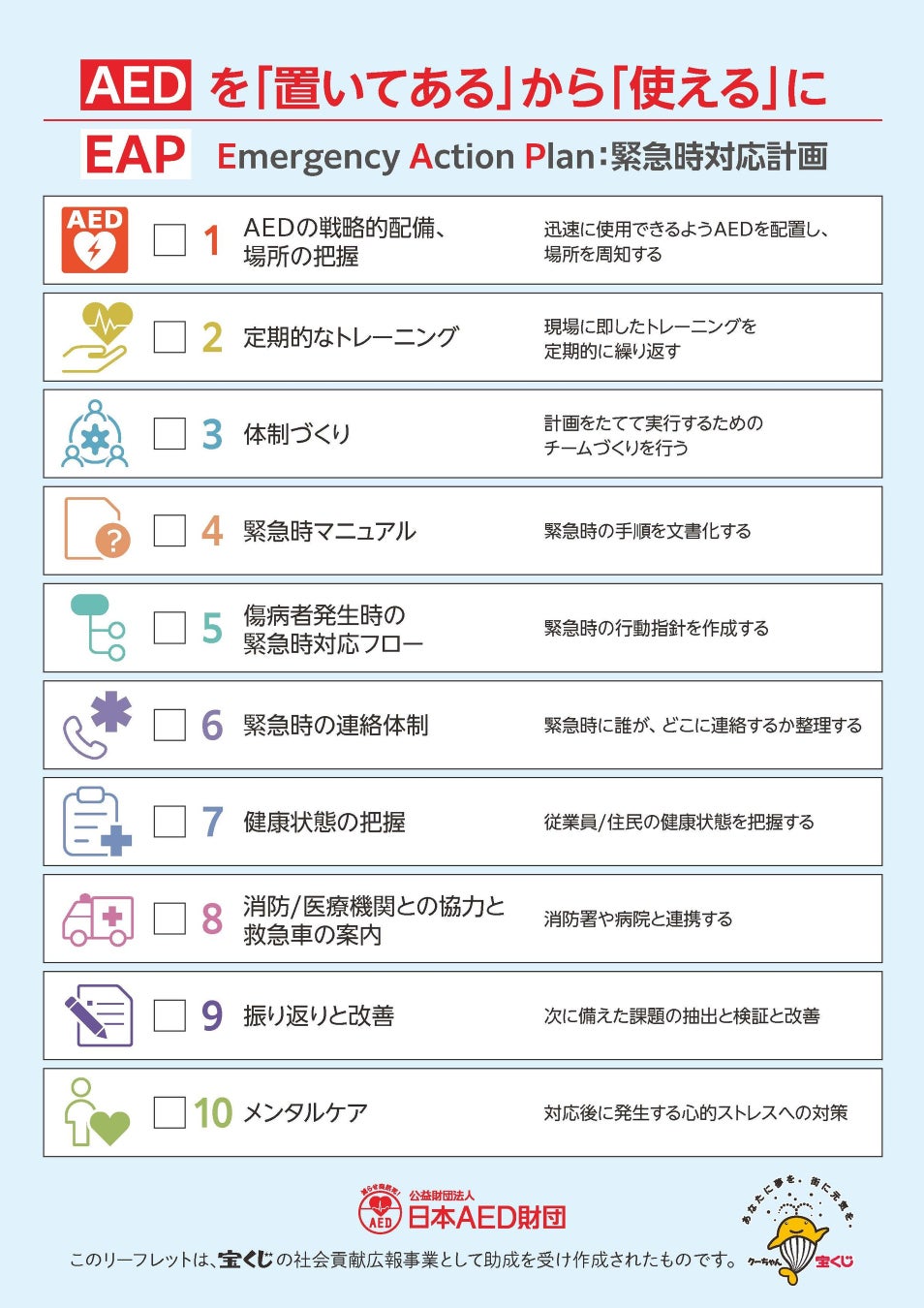 公益財団法人日本AED財団(所在地:東京都千代田区、理事長:三田村 秀雄)は、この度、「緊急時対応計画(Emergency Action Plan: EAP)」のリーフレットを公開しました。