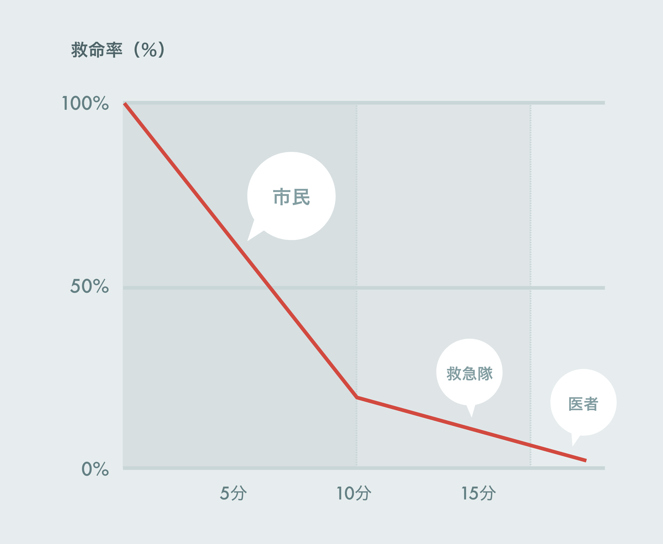 119番通報をしてから救急車が到着するまでの平均時間は10分。電気ショックが1分遅れるごとに救命率は約10%ずつ低下します。