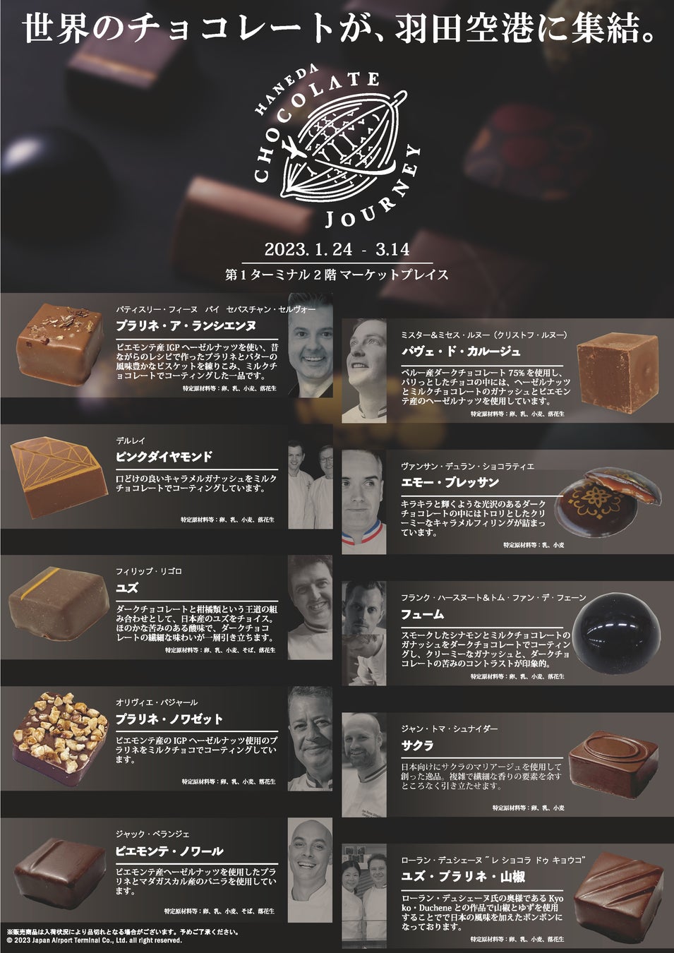日本空港ビルデング株式会社は、約20 のブランドと10 名のパティシエのチョコレートが集結するチョコレートの祭典「HANEDA CHOCOLATE JOURNEY」を1 月24 日から羽田空港第1ターミナルマーケットプレイスで開催します。