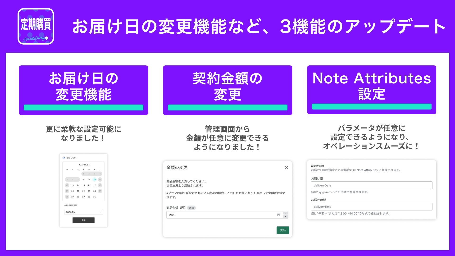 株式会社ハックルベリー(東京都渋谷区、代表取締役社長:安藤 祐輔、以下「ハックルベリー」)が提供する定期購買APIに対応した日本初のShopify(ショッピファイ)アプリ「定期購買」に、「お届け日の変更機能」、「契約金額の変更」、「Note Attributes設定」を追加アップデートしたことをお知らせします。