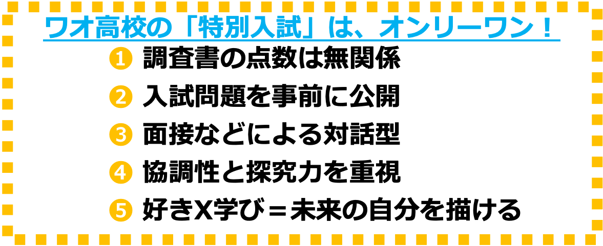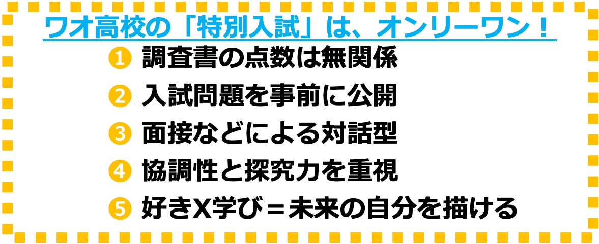 ワオ高校は、子供たちの協調性や探究力、「心」を重視しない高校入試のあり方そのものに改革を起こすべく、総合選抜型で唯一無二の「特別入試」を11月に実施します。現在の高校入試は、ほとんどが制限時間ありの一斉のペーパーテストです。子供たちが受験勉強に費やす時間や努力を全て否定はしませんが、一人一人に向き合わない入学試験で、生徒を正しく評価できるのか?という課題を持っています。ワオ高校では、“入学してから”ではなく、“入試”の段階から、自分の好きなことに向き合い、このVUCA時代を生き抜く学びの力を身につけてもらいたいと願っています。