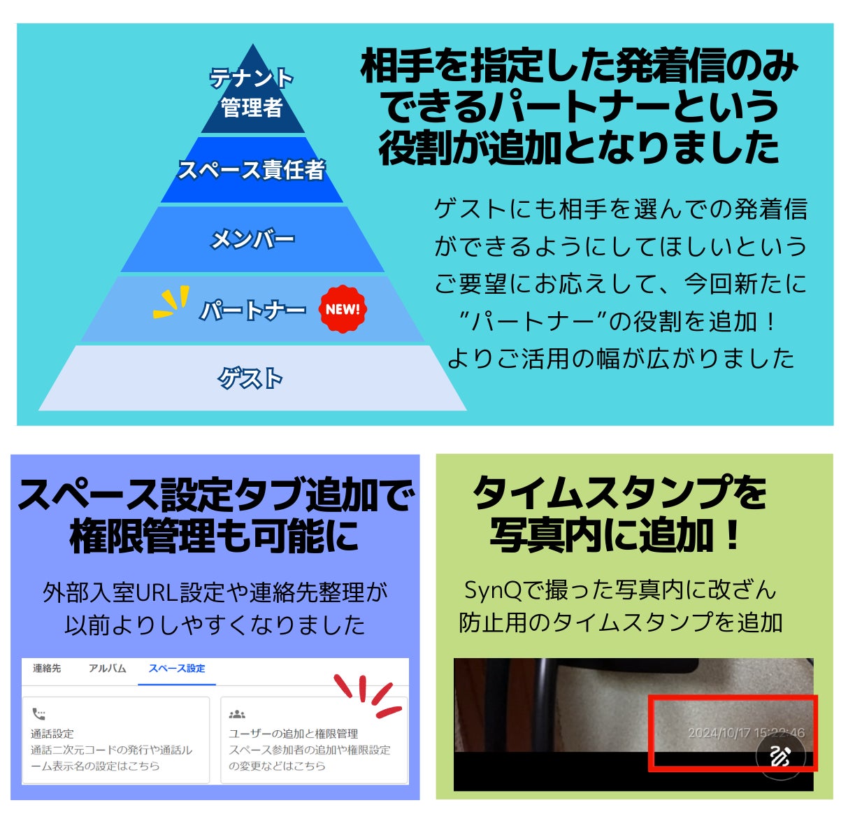 SynQ Remote(シンクリモート)は、建設業や設備インフラ業、製造業などを中心にご導入いただいております。多くのお客様から「外部の人から発着信を受けたい」「現場で撮影した静止画や動画データは閲覧不可にしたい」などのご要望を受けて”パートナー権限”の追加開発に至りました。また、昨今の改ざん等防止の観点から、静止画に自動的にタイムスタンプが付与される”改ざん防止機能”の開発も行いました。今後も、ユーザーの実際の声に耳を傾け、生産性向上のための機能追加とサービス改善を進めていきます。
