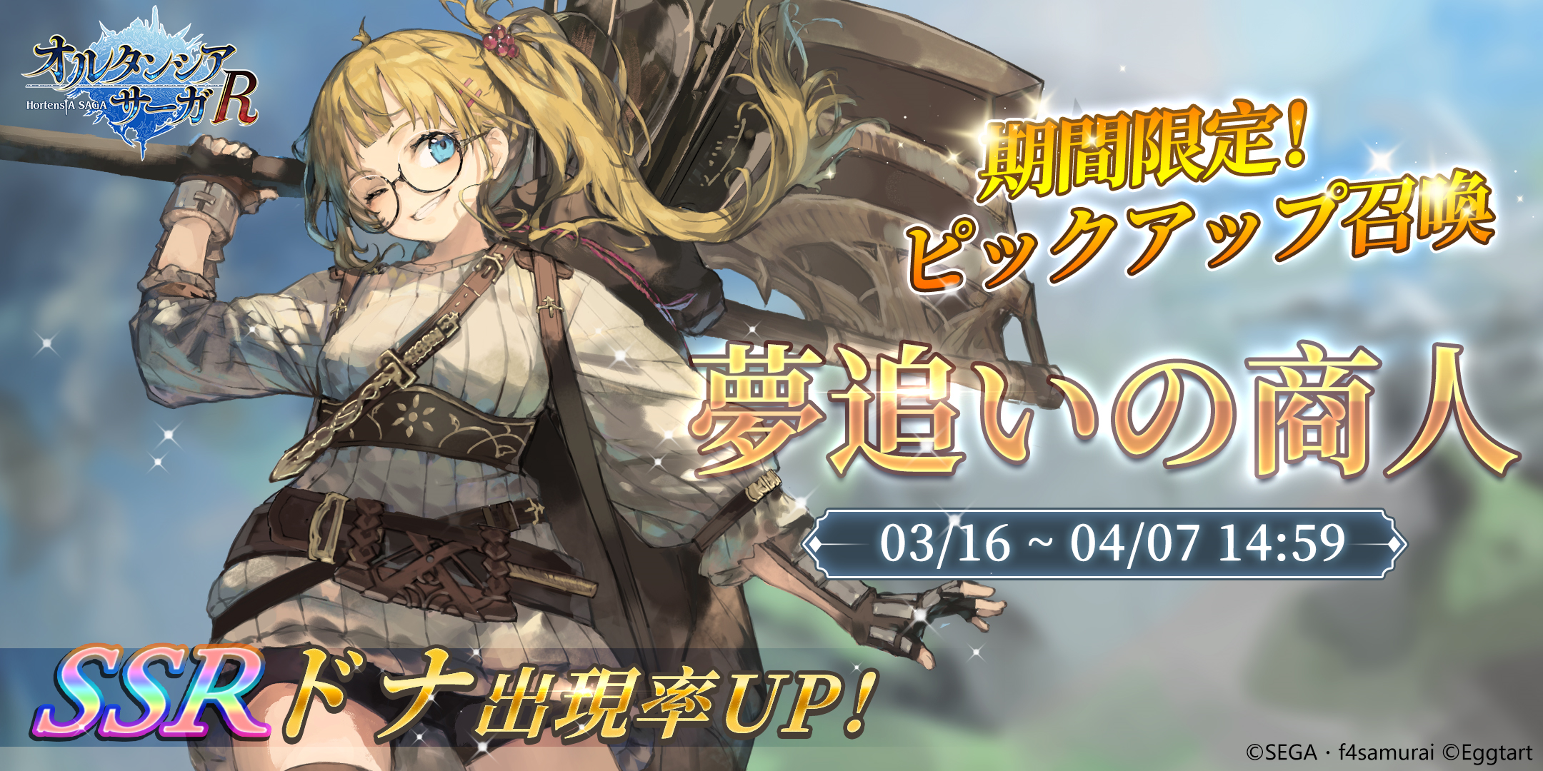 好評配信中のiOS/Android向け3Dアニメ×戦記RPGゲーム『オルタンシア・サーガR(以下「オルサガR」)』は、3月16日(水)より、『オルサガR』オリジナルキャラクターが登場するピックアップ召喚“夢追いの商人”を開始いたしました。