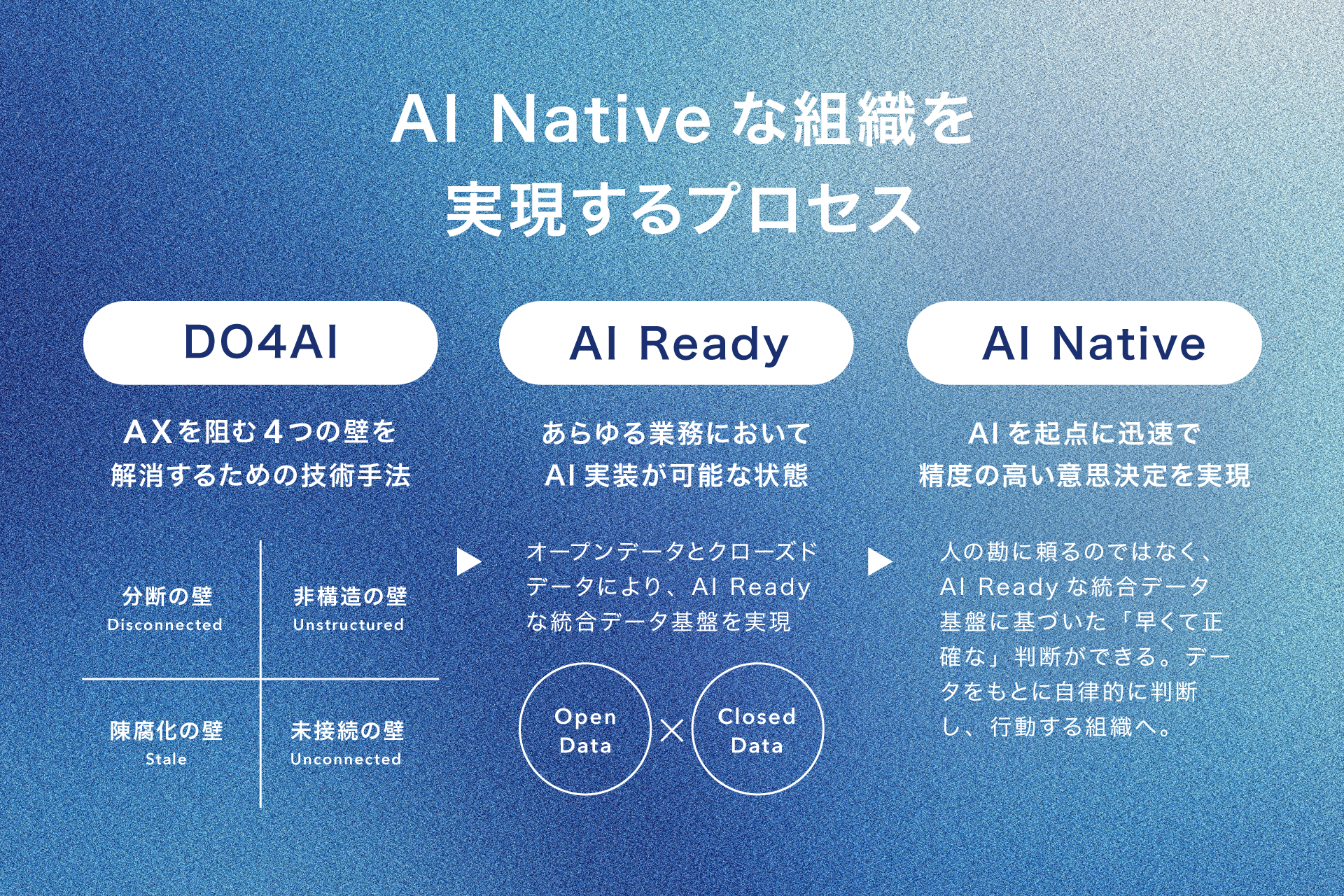 DO4AIによって実現されるのは、AIを“使う”企業ではなく、AIが“前提となる”企業です。企業は、単にデータを蓄積する組織から、データをもとに自律的に判断し、行動する組織へと進化し、「AI Nativeな組織」へと変革していきます。