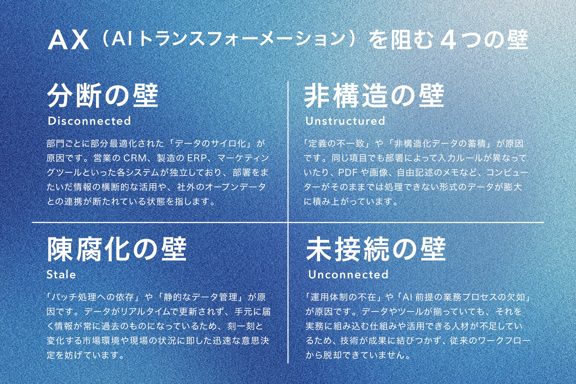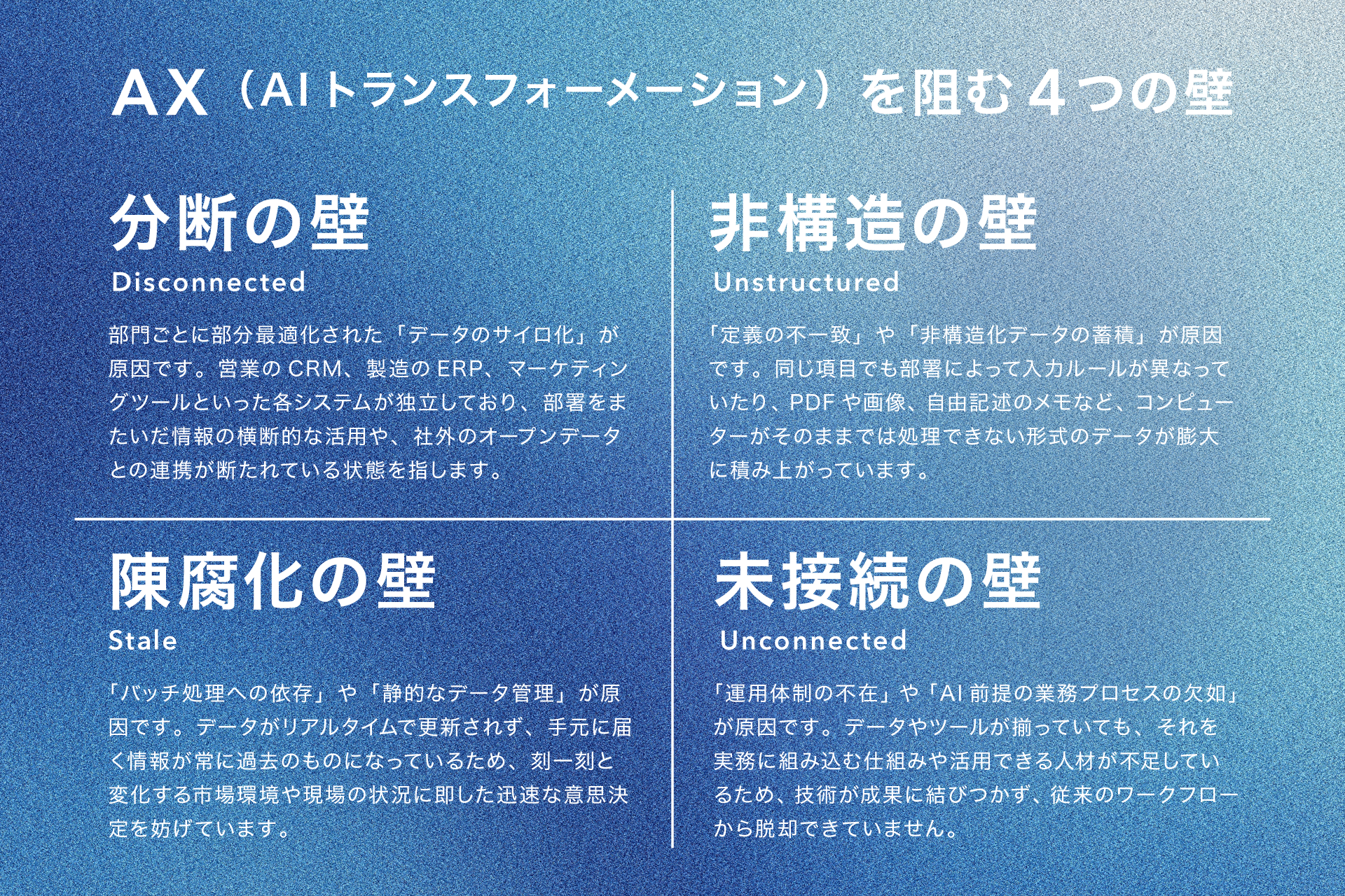 当社ではAXを阻む要因を「4つの壁」と「8つのKSF(Key Success Factor)」として整理し、「AI Readyではないデータ基盤」こそが、AI活用を阻む本質的な構造課題だと考えています。