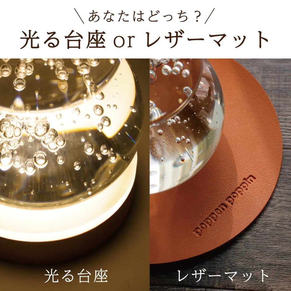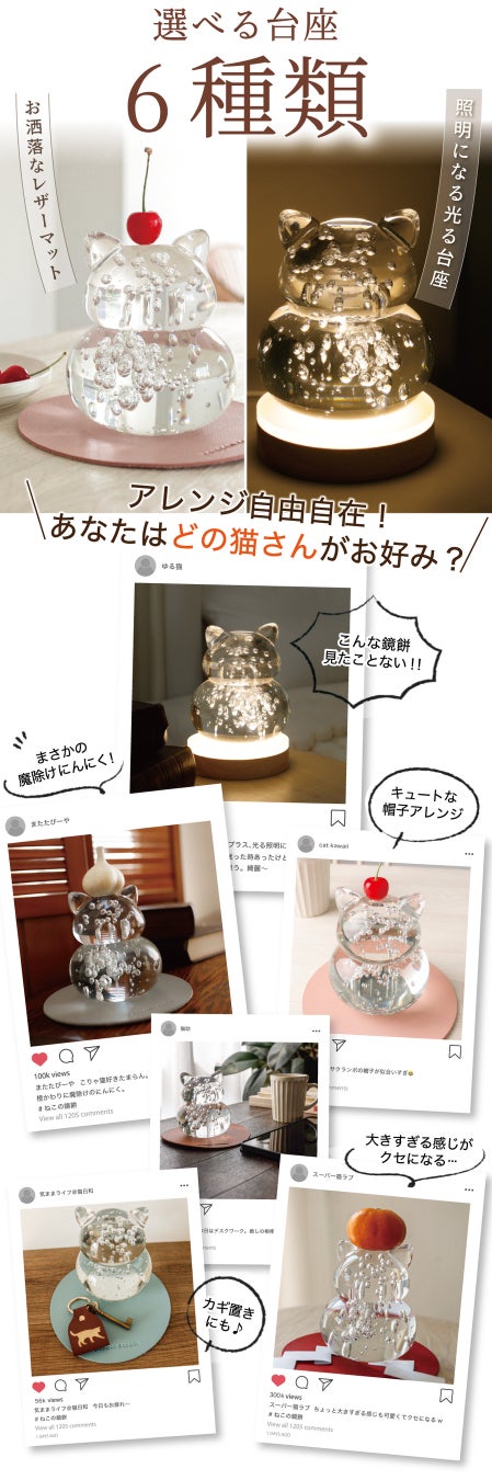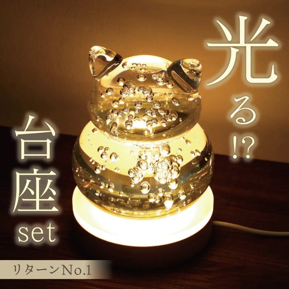 猫モチーフのガラス製鏡餅。鏡餅特有の柔らかい丸みは「円満に年を重ねる」を表します。光る台座/レザーマット付き