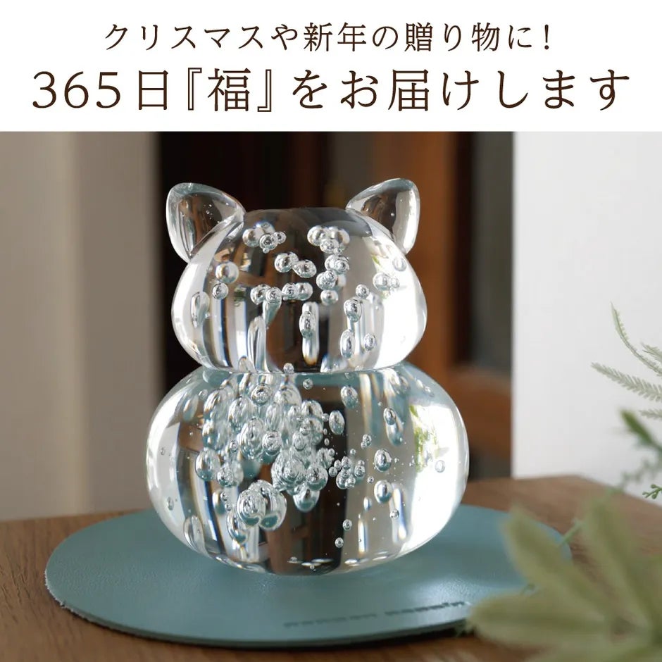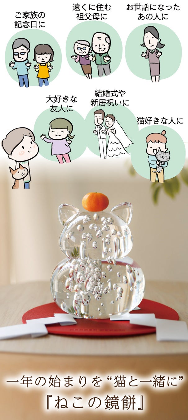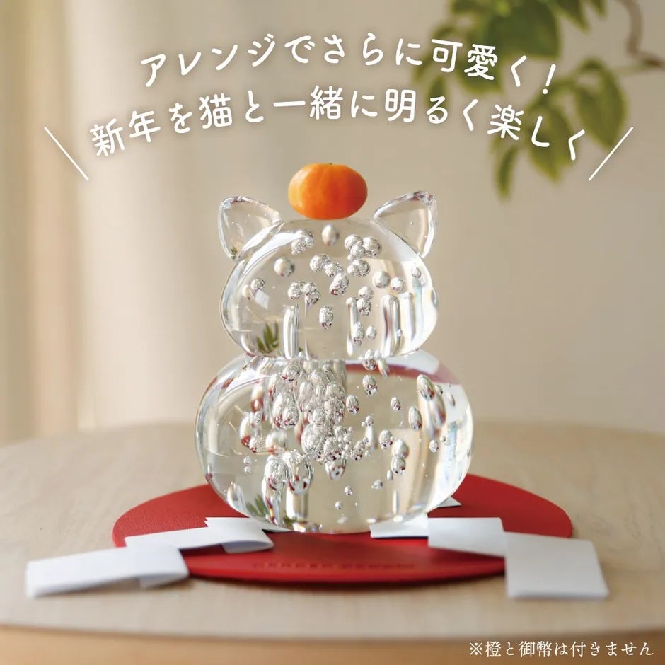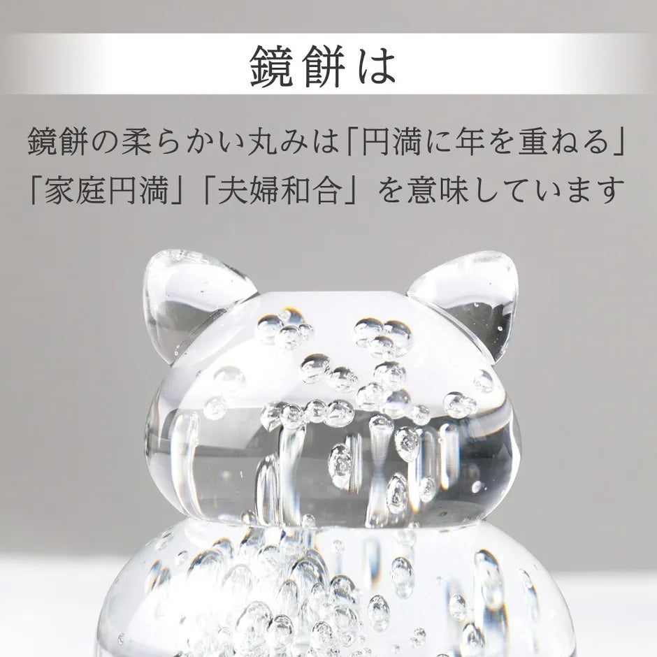 ピンとたった耳は元気の証!猫をモチーフにしたガラス製の鏡餅です。鏡餅特有のぷっくりした丸みは「円満に年を重ねる」「家庭円満」「夫婦和合」を意味しています。猫と一緒に、お正月を祝いませんか♪“福を365日重ねていただきたい”という想いから、日常使いできるデザインと台座にこだわりました。猫の愛らしいフォルムとガラスの無垢な美しさを是非ご堪能ください。