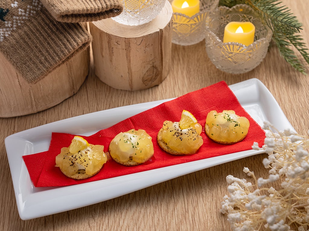 全粒粉のクラッカーに、カマンベールチーズとリンゴジャムをトッピング。粗挽きブラックペッパーがアクセントです。