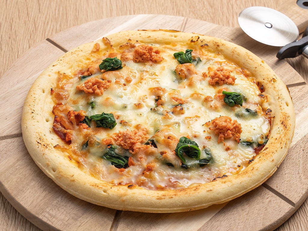 ・山形赤根ほうれん草と鮭のピッツァ ※写真右下