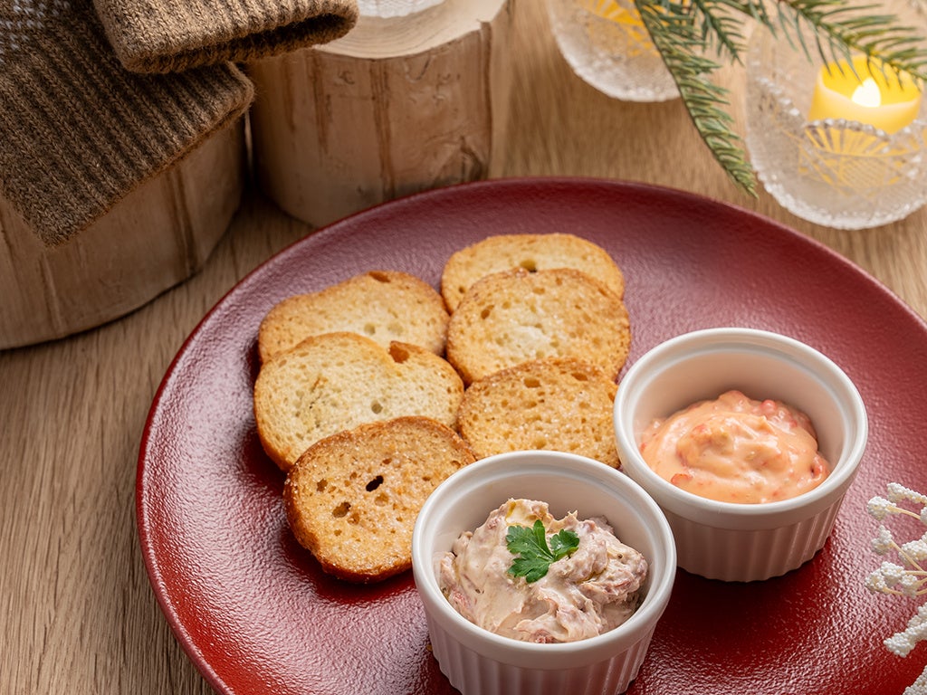 ラスクとディップソースがついたおつまみセットです。コンビーフとクリームチーズ・梅肉と柚子胡椒のマヨソースの2種類をご用意いたしました。
