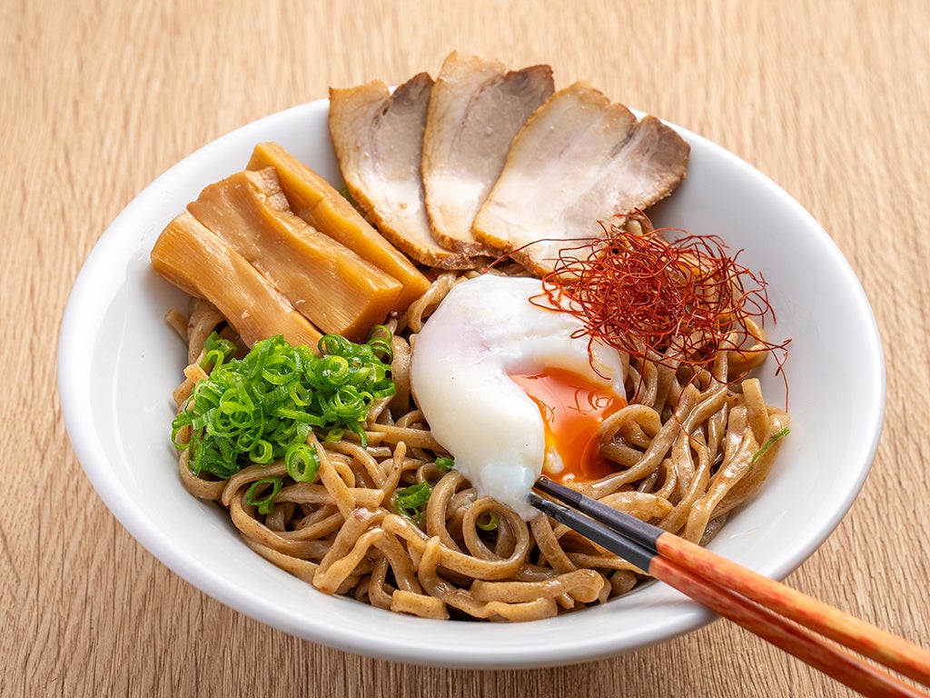 庄内産全粒粉を混ぜ込んだ麺を使用し、魚介系のピリ辛たれで仕上げました。紅花卵が辛さをマイルドにしてくれる、濃厚なまぜそばです。