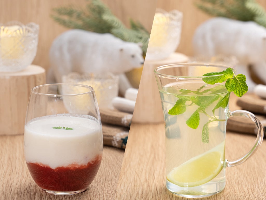 1階サウナラウンジと2階ラウンジには、冬限定「オレンジ× ローズマリー」、「ミント× イチゴ」のデトックスウォーターをご用意しております。