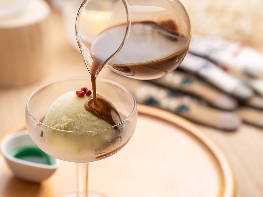 バニラアイスにミントシロップをかけ、チョコレートソース入りのアイスカフェオレを注いでお召し上がりいただきます。ピンクペッパーがアクセントの、やみつきになる一杯です。