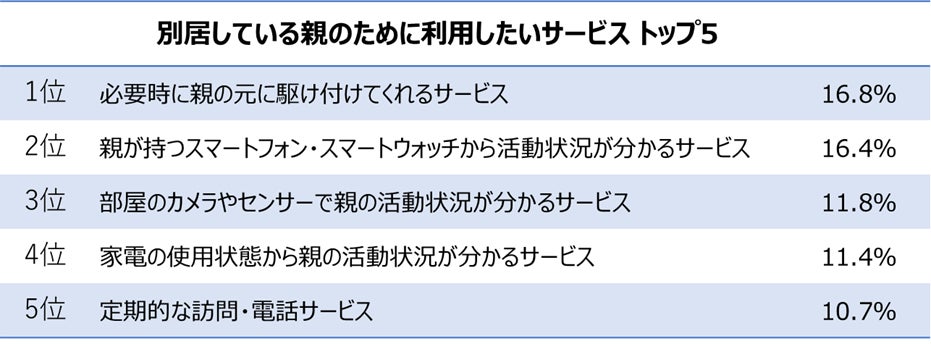 また、別居している親のために今後利用したいサービスについて全体に聞いたところ、1位「必要時に親の元に駆け付けてくれるサービス」(16.8%)、2位「親が持つスマートフォン・スマートウォッチから活動状況が分かるサービス」(16.4%)、3位「部屋のカメラやセンサーで活動状況が分かるサービス」(11.8%)で、「もしもの時に駆け付けてくれる」「親の行動や状況が把握できる」といったサービス需要が一定数あることが明らかになりました。【図6】