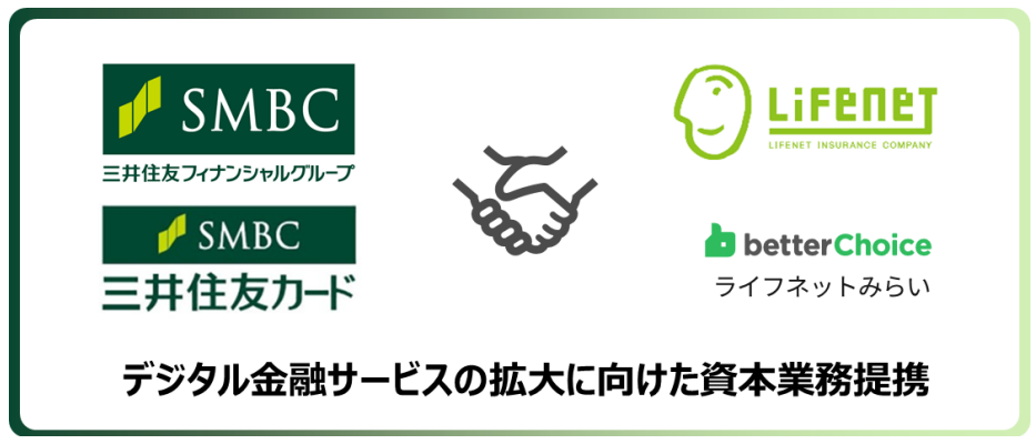 この度、提携をより一層強化させ、個人のお客さまに向けたデジタル金融の革新をSMBCグループ及びライフネット生命グループで取り組み、保険商品と決済サービスとの連携を通じて両グループのサービスを提供するこ とを狙いとして、SMFG、三井住友カード、ライフネット生命及びライフネットみらいの 4 社で、改めて資本業務 提携契約を締結しました。