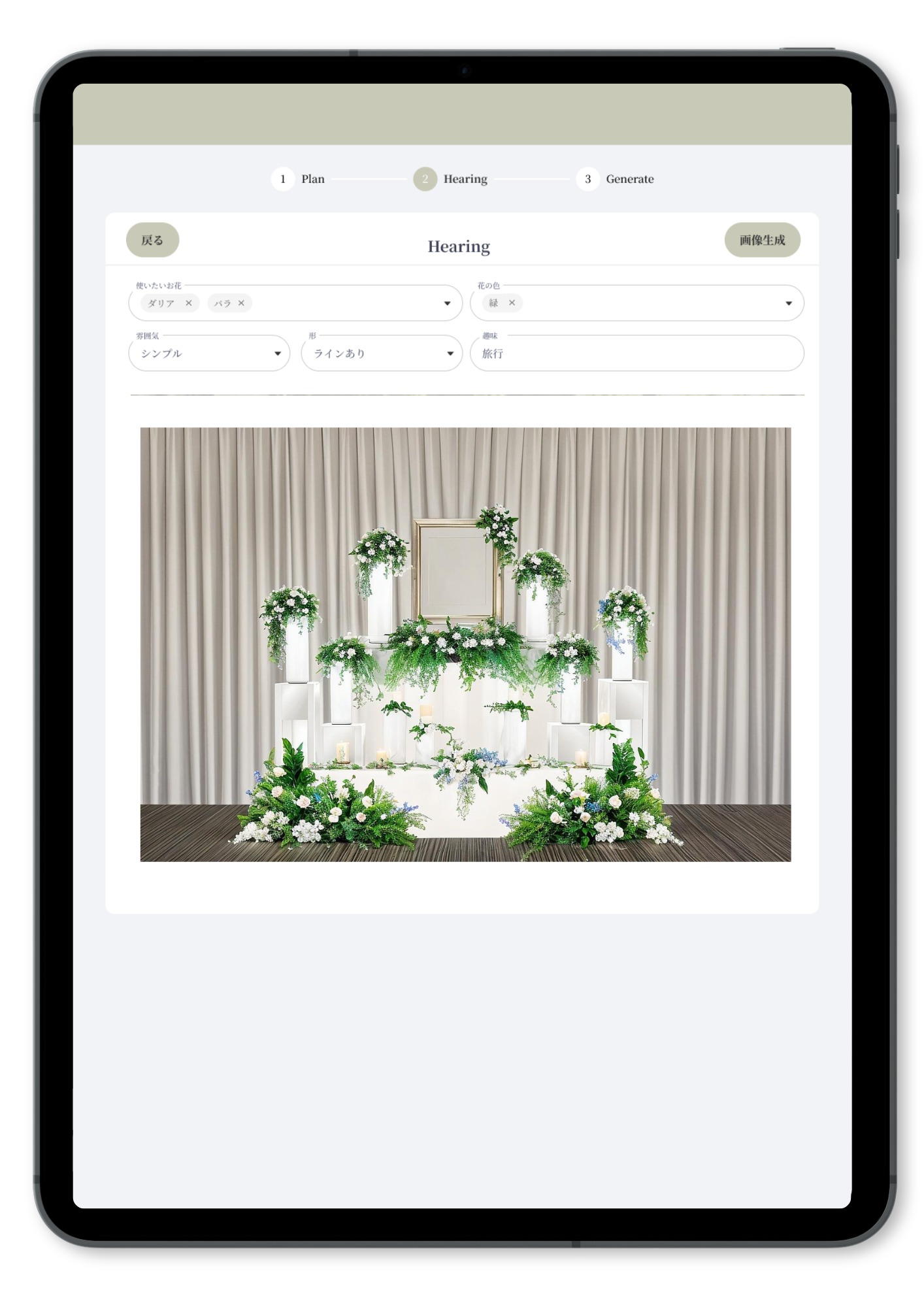 インターネットを介して、WEBブラウザ上で動作するアプリケーションを使い、花の種類・色・形、予算や故人様の趣味などを入力するだけで、自動的に新しい生花デザインを生成します。入力項目は事業者ごとにカスタムが可能。AIに学習させる祭壇データも増やすことができるため、生前の趣味嗜好に合わせた故人様らしい祭壇や、ご使用いただく事業者の特色に合った幅広い提案が可能となります。祭壇デザインは1分ほどで作成。時短、工数削減にもつながります。リリースは2024年秋頃を予定しております。