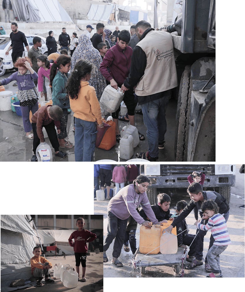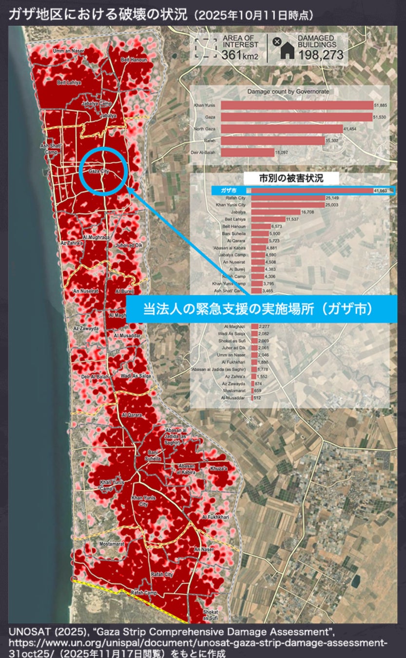 2025年10月にはイスラエルとハマスの間で停戦合意がなされましたが、散発的な攻撃が継続しており、建物の倒壊・破壊は壊滅的(左図参照)で、また全てが不足している危機的状況です。