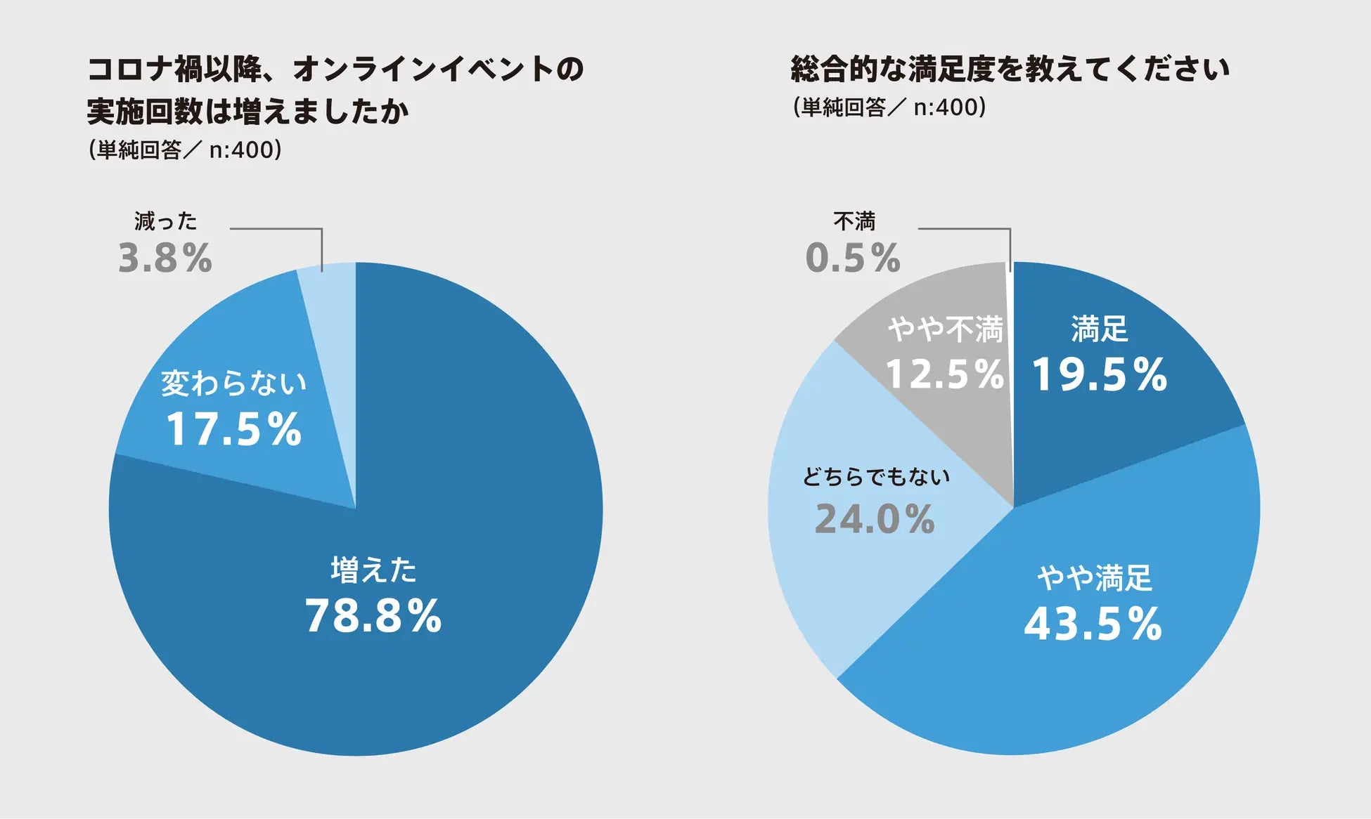 そして昨今のコロナ禍以降、オフラインではなくオンラインでのイベントが定番化。約80%の企業がオンラインでのイベントの実施回数が増えたと回答。(※1)