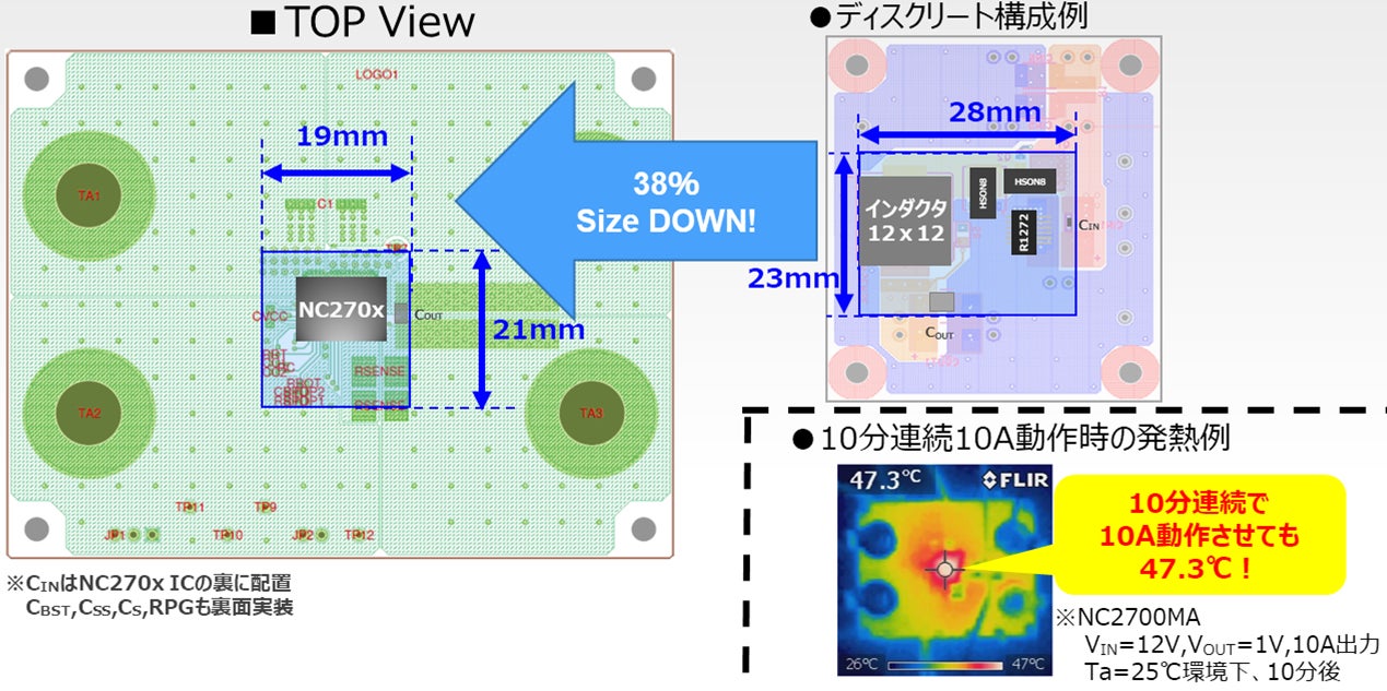 本製品はインダクタ、FET、バイパスコンデンサ(ノイズ低減用)が1つのパッケージに内蔵されているモジュール製品で、入力/出力コンデンサなどを本製品のすぐそばに配置するだけで、最大20Aまでの電源回路を簡単に基板設計できます。また、高放熱パッケージを採用しており、放熱性にも優れています。