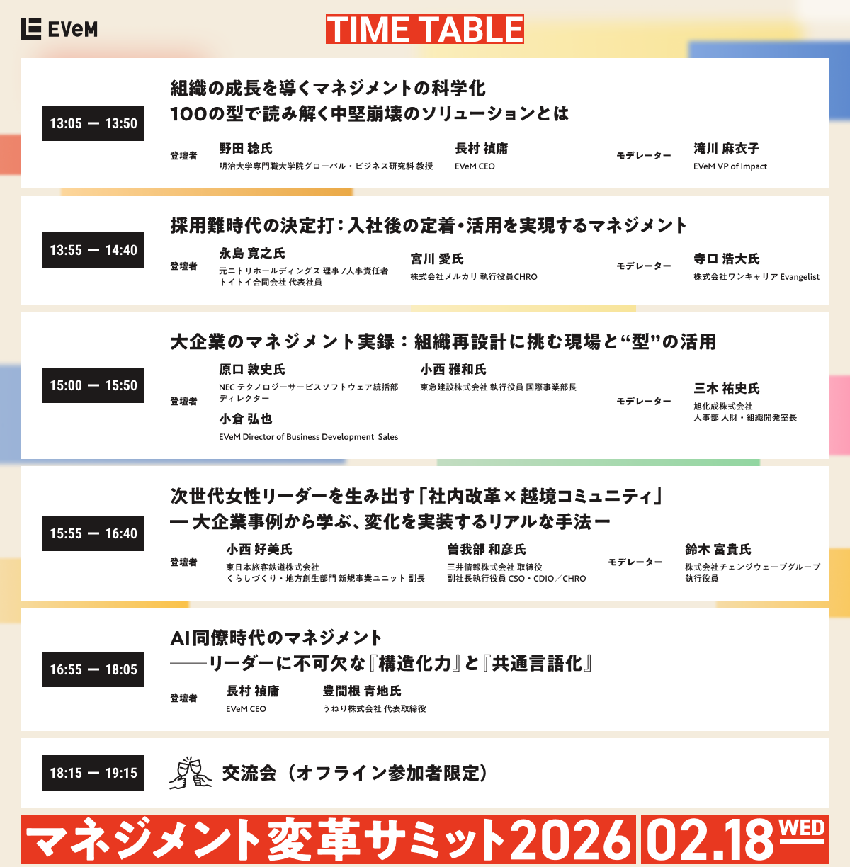 マネージャーイネーブルメントサービスを提供する株式会社EVeM(本社:東京都新宿区、代表取締役:長村 禎庸)は、2026年2月18日(水)、コングレスクエア日本橋にて、「マネジメント変革サミット2026 ーすべての挑戦をエンパワーする」を初開催します。会場参加(抽選制)のほか、オンラインでもご視聴いただけます。