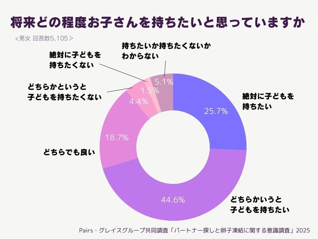 株式会社グレイスグループ(東京都渋谷区、代表取締役CEO 勝見祐幸、以下 グレイスグループ)は、恋活・婚活マッチングアプリ「Pairs(ペアーズ)」を運営する株式会社エウレカ(本社:東京都港区、代表取締役CEO:山本竜馬、以下 ペアーズ)の「パートナー探しと卵子凍結に関する意識調査」を共同で企画し、男女別に集計した結果を2025年4月23日に公開しました。