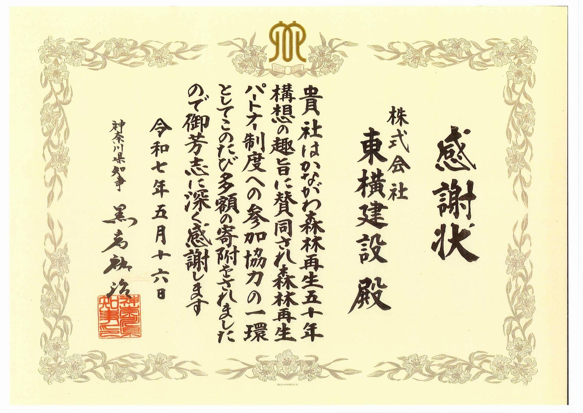 東横建設が森林再生パートナーへの参加協力に伴い、感謝状を頂きました。