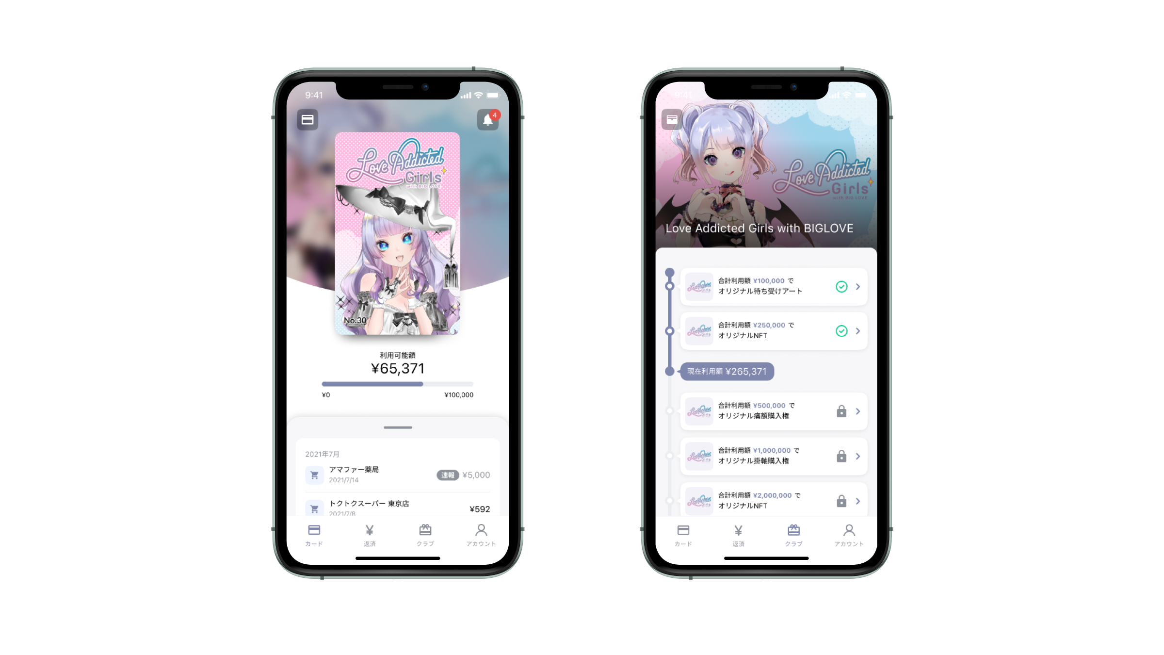 Nudgeが行っている実証実験”Cashless to earn”は、カードの利用金額に応じて、NFTを特典として提供します。今回新たに開設する「SoudanNFT」「Love Addicted Girls」クラブでは、通常の特典に加えて、SoudanNFTとLove Addicted Girlsの限定NFTを特典としています。