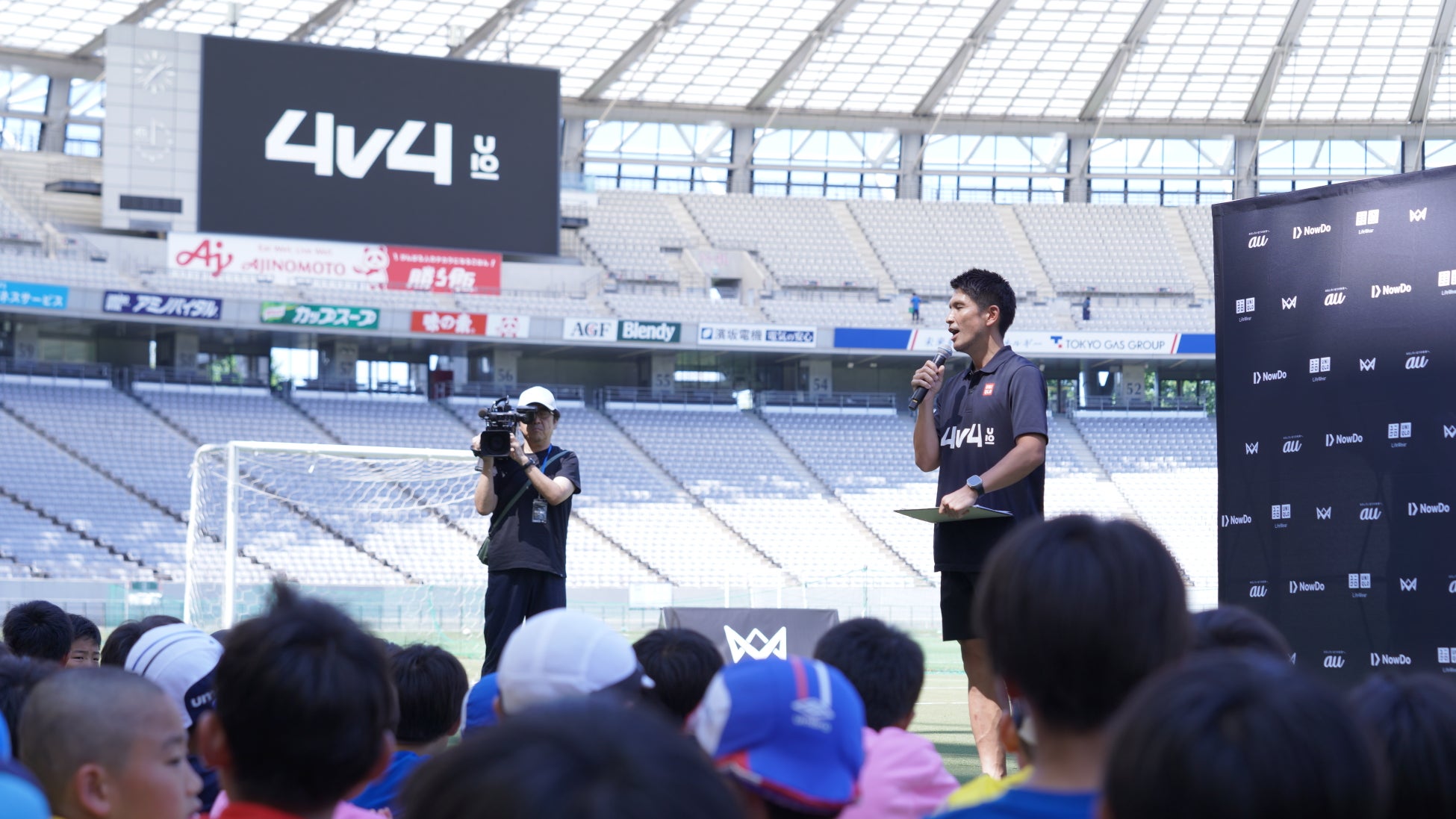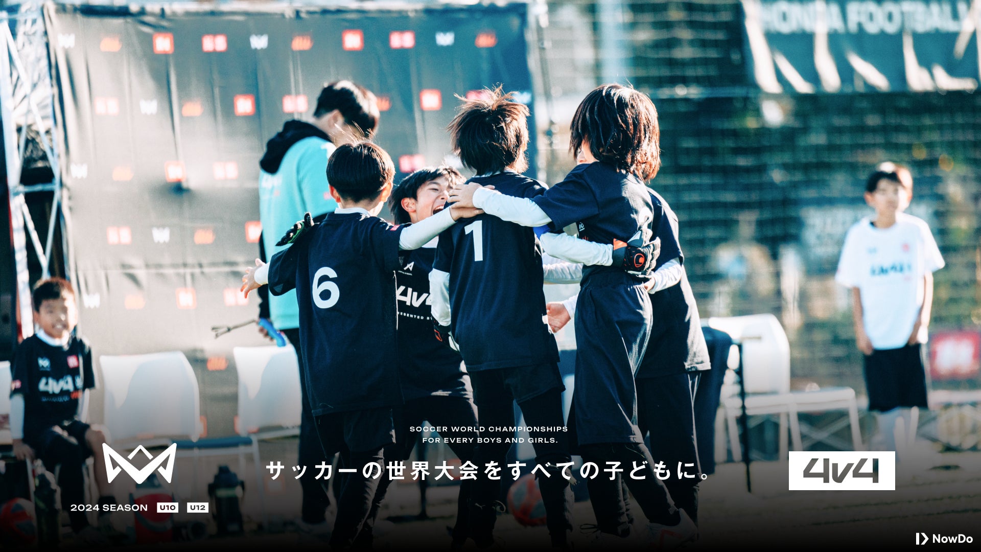 「4v4」とは日本のサッカー界をさらに盛り上げるべく、サッカー界の本田圭佑が考案した新しい4人制サッカー全国大会です。本大会は「サッカーの世界大会を全ての子どもに」というミッションのもと、育成年代の小学生の子ども(U10、U12)向けに2023年に開発された新しい競技です。ルールは10分1本勝負であり、交代は自由です。また、ショットクロックは20秒で、GKはフィールドプレイヤーとして果敢に攻撃に参加することができる、という全く新しいサッカーのルールです。本大会では子どもたちの自主性を大切にするためにベンチには監督やコーチは存在しないことや、一度負けて終わりではなく何度も挑戦できるようなポイント制度などを取り入れています。子どもたちはシーズンを通じてポイントを多く獲得することでJAPAN CUPに出場し、日本一を目指します。子どもたちが社会にでて必要な自ら考え行動する力を育み、未来のサッカースター候補を育成することで、日本のサッカー界全体の成長に繋げます。
