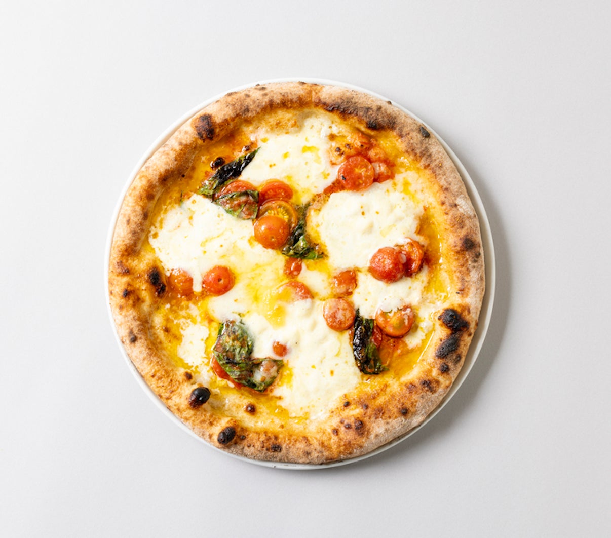 全粒粉を使用した生地に、自家製トマトソースとフレッシュなチェリートマトを合わせました。国産のミルクを使った、毎朝作りたての自家製のブラータチーズを大胆に合わせます。トマトの酸味とフレッシュでミルキーなチーズの相性が抜群の定番ピザ。