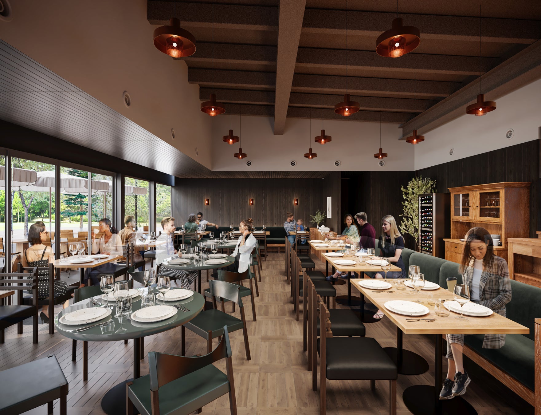 海や山に囲まれた自然豊かな鎌倉で、庭のある家(= GARDEN HOUSE)に大切な家族や友人を招き入れるように楽しんでいただきたいという想いと共に、2012年に誕生したレストラン「GARDEN HOUSE」。その思いを継承し、公園内という立地を大きなガーデンと捉え、店舗とガーデンがシームレスに繋がり、自然との一体感を感じられる空間を演出しています。また、広島城の外壁にも用いられている「焼杉」を店内のメイン素材に採用しました。瀬戸内地域に広く普及している木材処理加工である焼杉は、炭化した木材の美しい風合いと耐久性を備え、その製造過程ではCO2をほとんど排出しないため、環境への配慮も意識しています。