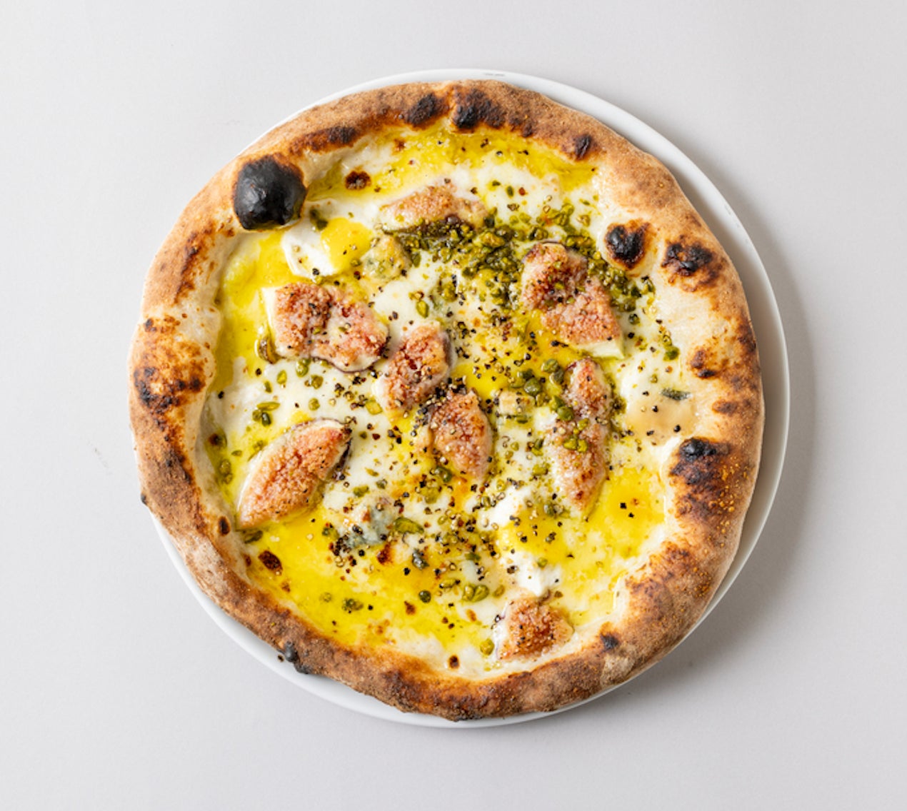 モッツァレラ、リコッタチーズ、ゴルゴンゾーラ、グラナパダーノの4種のチーズを使用し、広島で採れたフレッシュないちじく、瀬戸内のレモンを使用した自家製のレモンカードを合わせました。食感のアクセントにローストしたピスタチオをトッピング。瀬戸内海の地形や特徴から、地中海を彷彿とさせるピザに仕上げました。