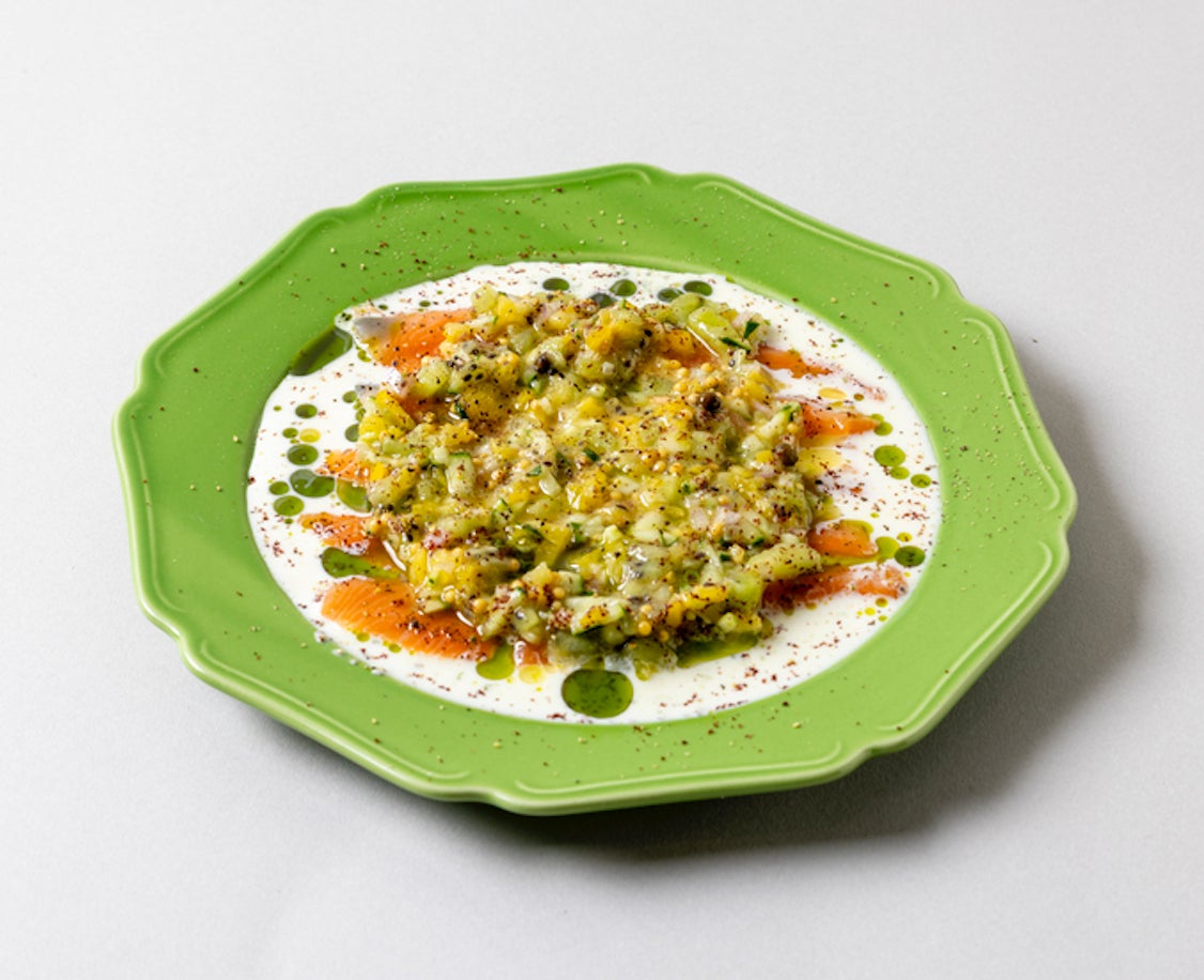 広島レモンサーモンのマリネ/キウイとパプリカのサルサ・バターミルク 1650円(税込)