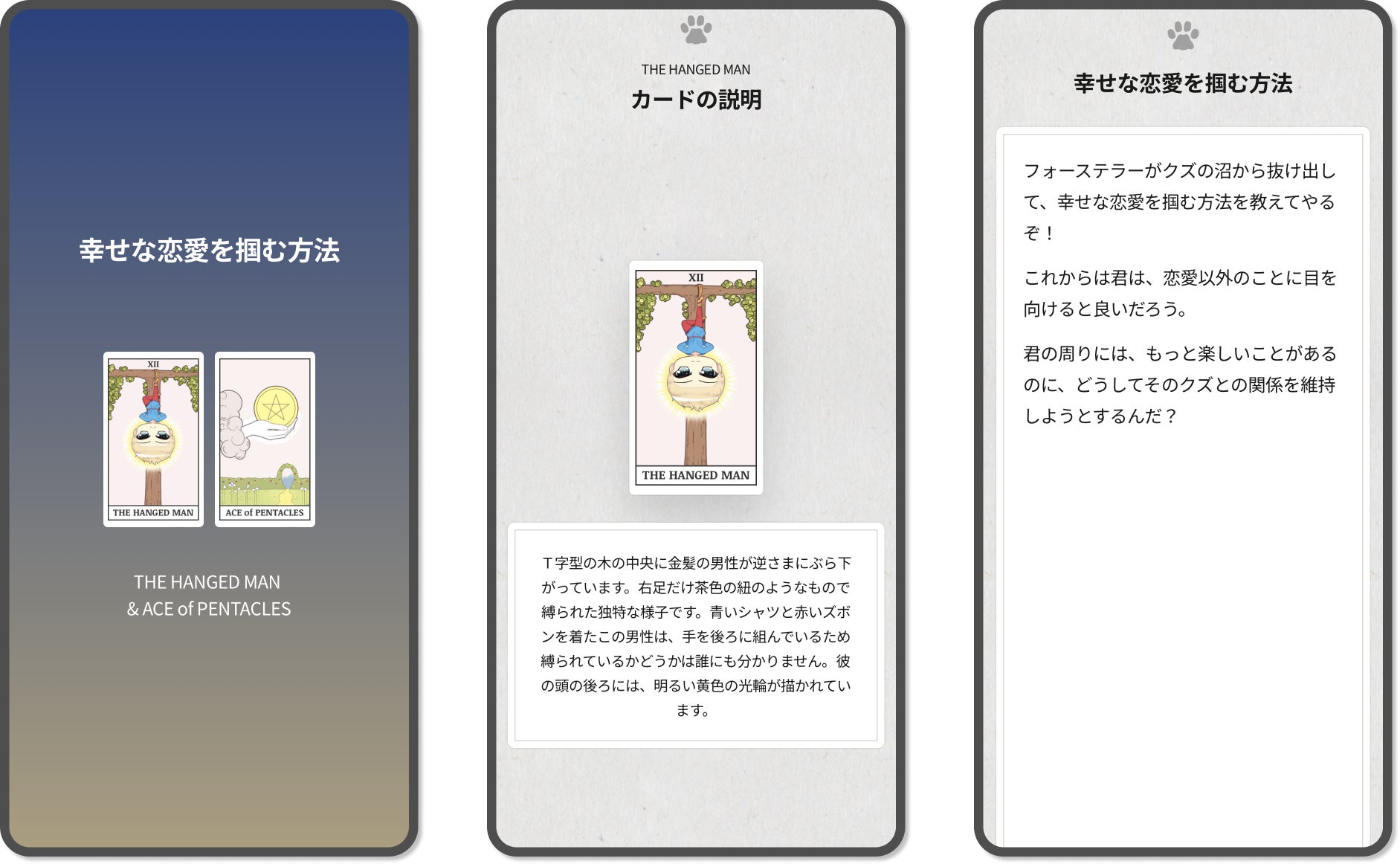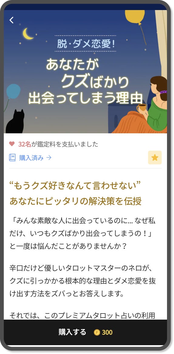 今回リリースされた「脱・ダメ恋愛! あなたがクズばかり出会ってしまう理由」 では、タロットカードを用いて、あなたがクズばかりと恋愛してしまう理由について占うことができます。