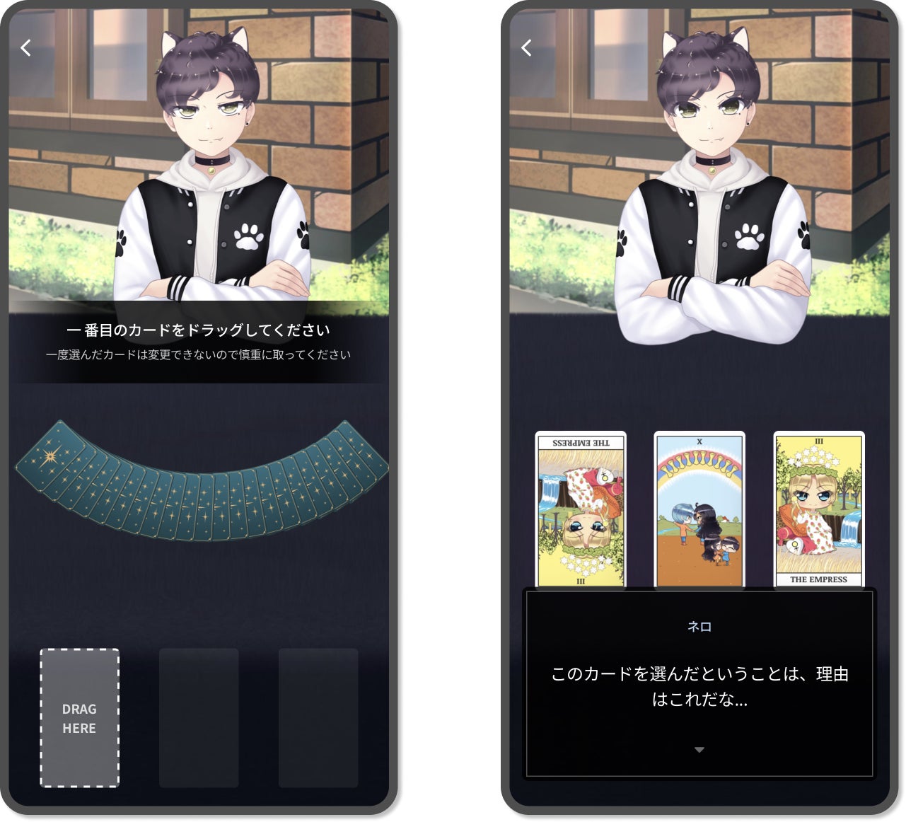 プレミアムタロットでは、AI占い師の指示に従いシャッフルされたカードを引くと鑑定結果を丁寧に説明してくれます。
