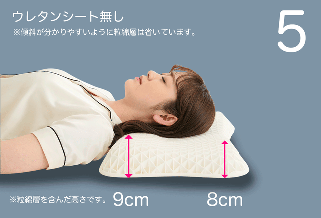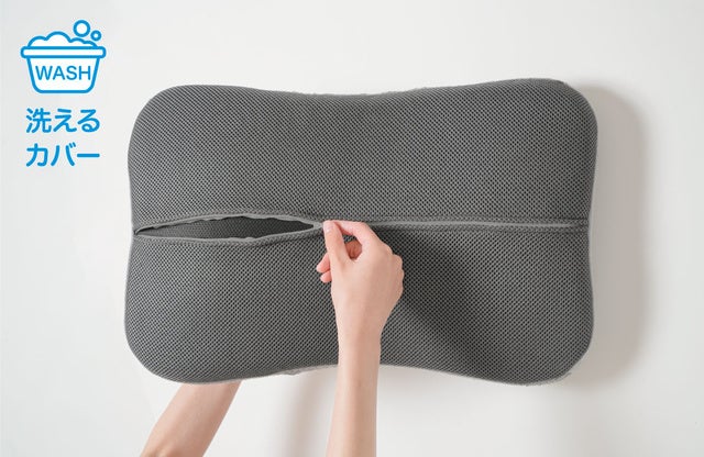 今回のテーマは、「心地よいゆらぎ感覚」です。その感触を実現するために、中材に粒綿とホワイトゲル、ウレタンを使用しました!また、中材の組み合わせにより8パターンの高さと傾斜の調節が可能となりました。枕カバーは、汗ばむ季節にうれしい消臭機能付きです!