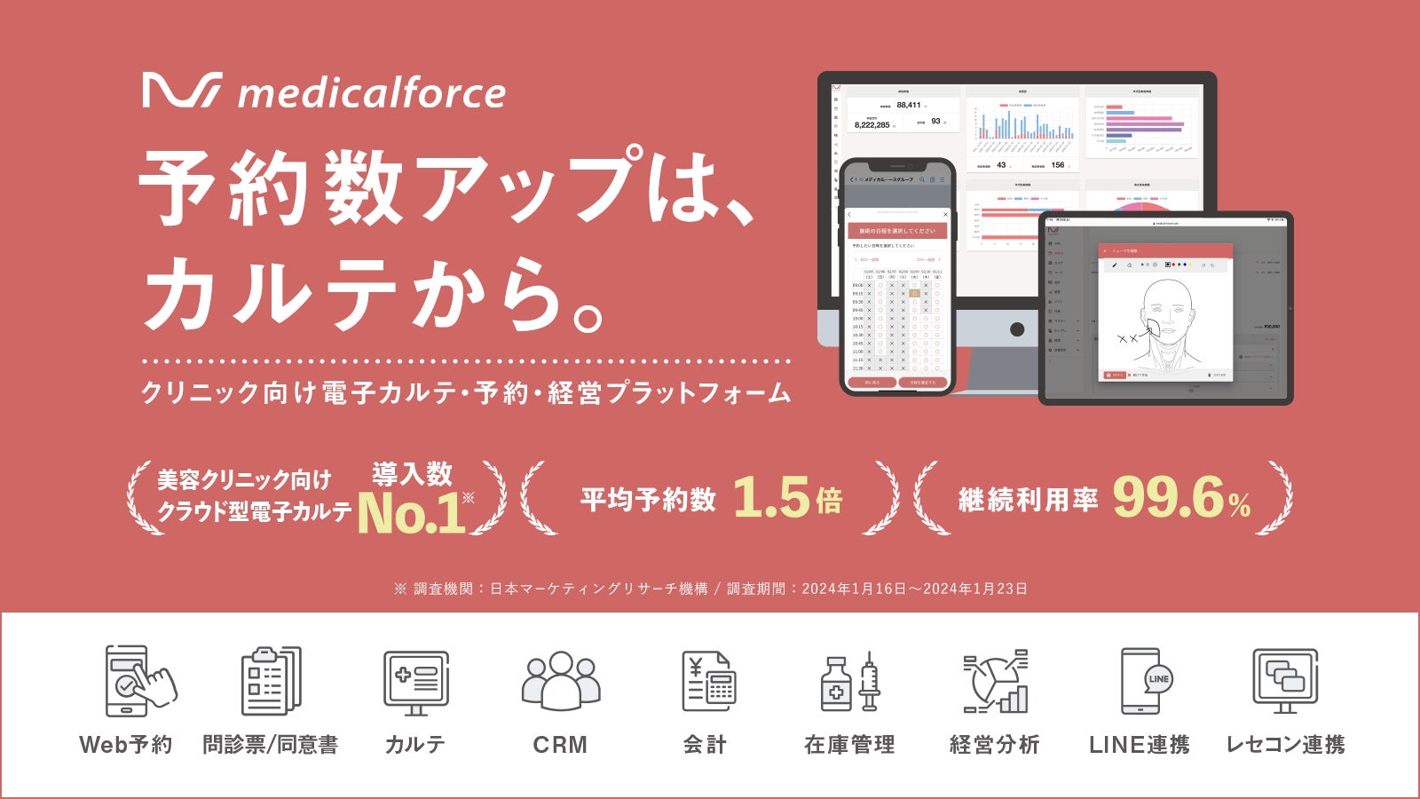 medicalforceは、自由診療クリニック向けオールインワンSaaSです。電子カルテ、予約管理、会計、在庫管理など、クリニックの業務フローに沿った豊富な機能により業務を効率化できるのはもちろんのこと、予約枠の最適化やLINE連携など、予約数の増加や売上向上を実現するための機能が充実しています。規模や診療科目を問わず、400院以上の自由診療クリニックで選ばれ続け、この度、「美容クリニック向けクラウド型電子カルテ導入院数」でNo.1のシェアを獲得※1いたしました。