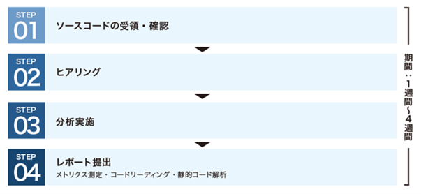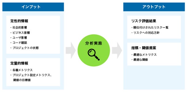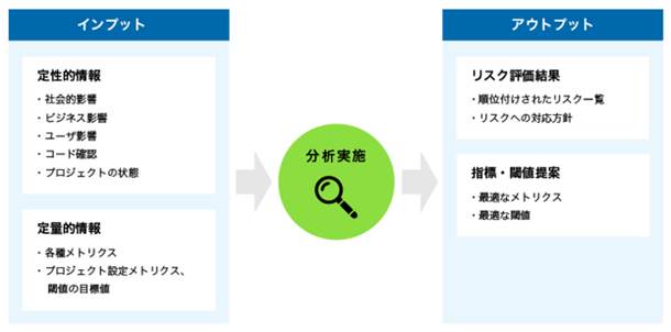 「コードリスクアセスメント」では、リスクの顕在化がもたらす社会やビジネスへの影響、顧客からのヒアリング結果に基づくプロジェクトの状態等の”定性的”データと、各種メトリクス等の”定量的”データをベースに、ソフトウェア開発とテストの両方に精通した“次世代QAエンジニア”がその知見を活かしてコード分析を実施いたします。