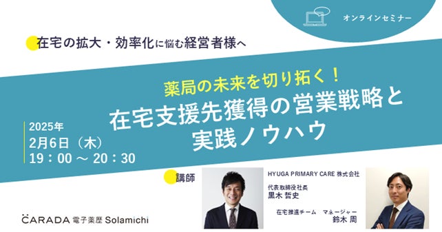 クラウド電子薬歴『CARADA 電子薬歴 Solamichi』の企画・開発・販売を行う株式会社ソラミチシステムは、薬剤師による在宅訪問、在宅訪問薬局のサポート事業を展開するHYUGA PRIMARY CARE株式会社の代表取締役社長 黒木哲史氏と同社マネージャーの鈴木周氏をゲストに迎え、無料オンラインセミナー「薬局の未来を切り拓く!在宅支援先獲得の営業戦略と実践ノウハウ」を2025年2月6日(木)19時より開催します。