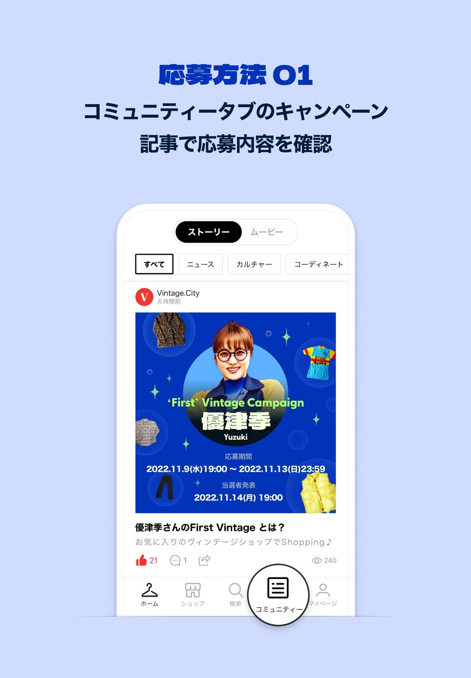 STEP1.ヴィンテージ・ファッション・アプリ「Vintage.City(ヴィンテージ・シティ)」内の「コミュニティ」ページに公開される「キャンペーン記事」で応募内容を確認。