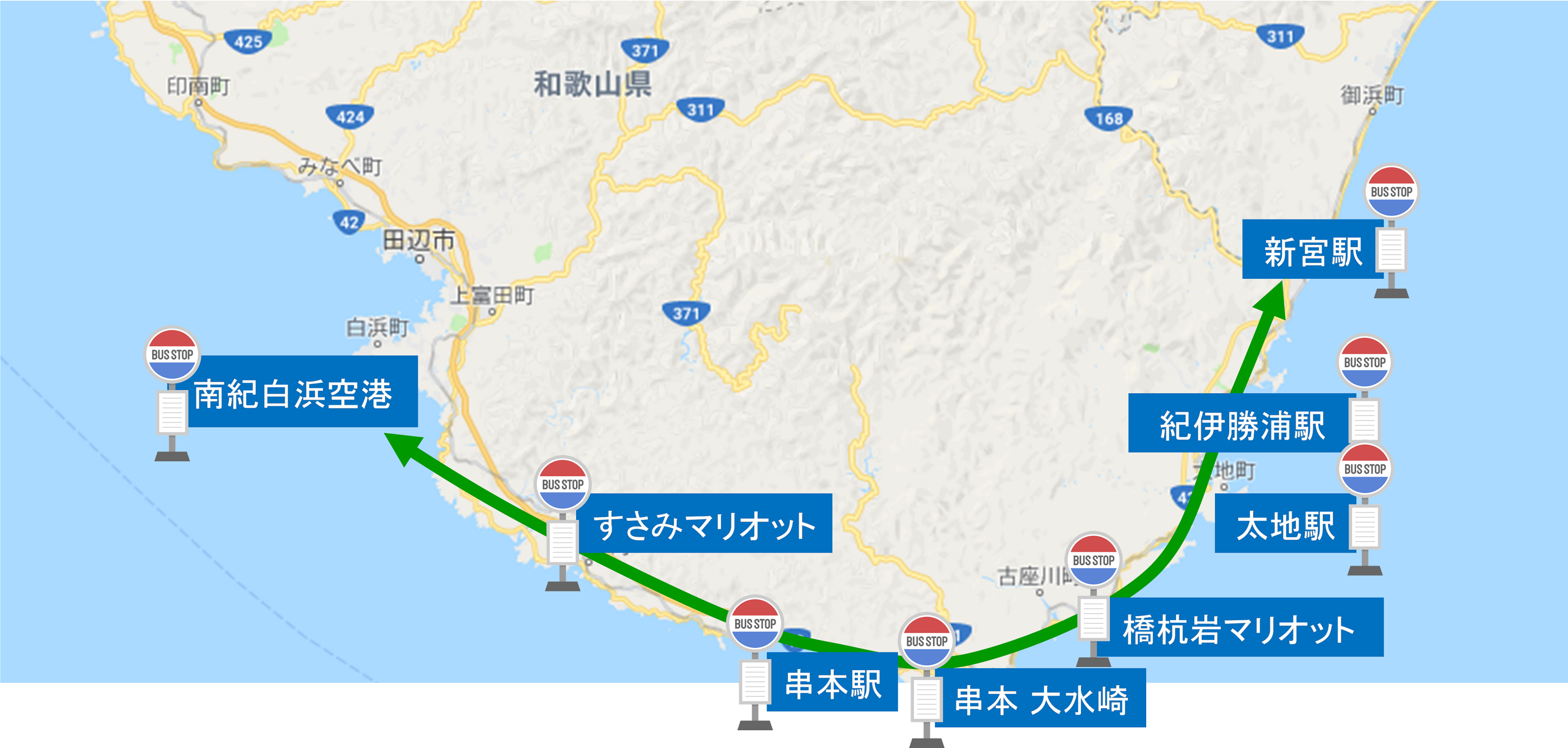 南紀白浜空港~JR新宮駅(路線延長は103km(片道)。国道42号及び紀勢自動車道(南紀白浜IC~すさみ南IC間)を1日2往復走行)