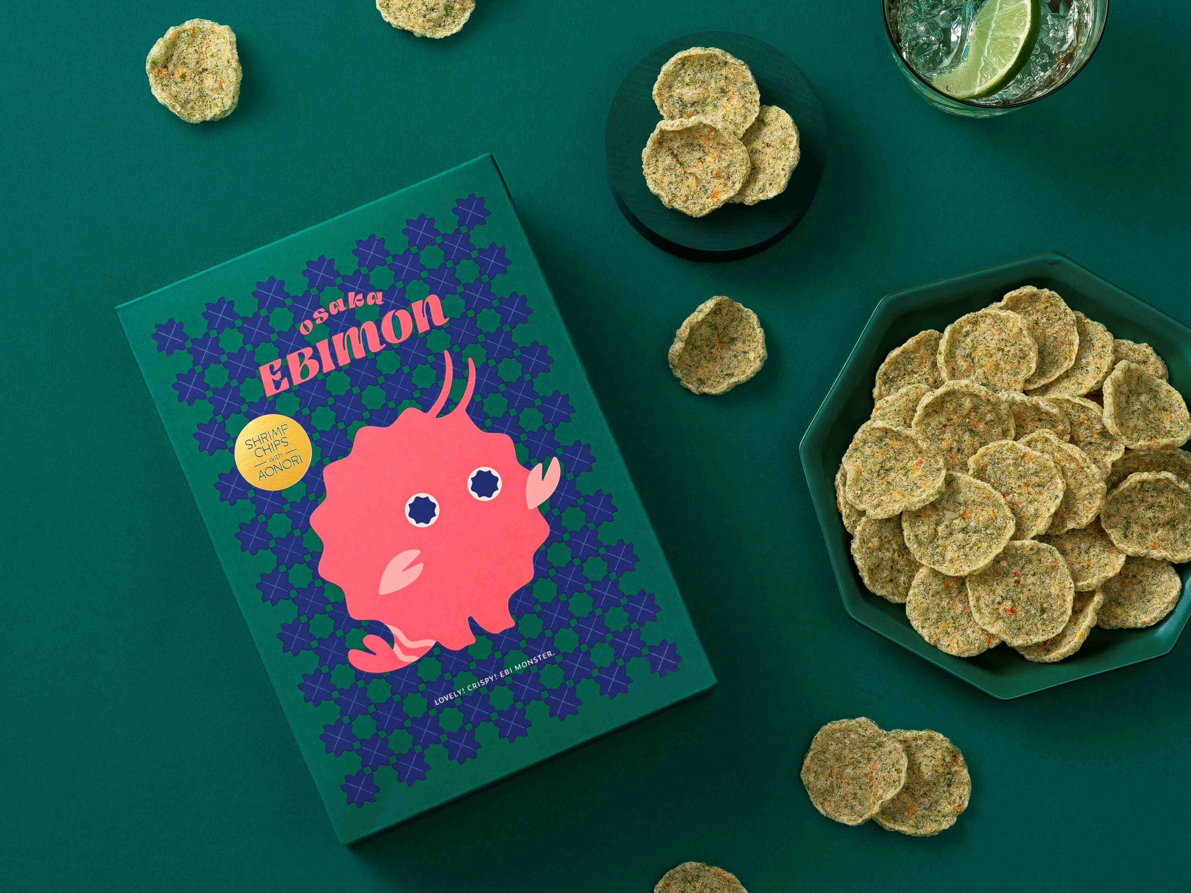 モンスターのキャラクターが目を引くパッケージの中身は、天然海老に国産青のりの風味がふわりと香る、カリッとサクッと揚げて軽やかなお煎餅。ご購入の方にもれなく、オリジナルステッカーをプレゼントいたします。