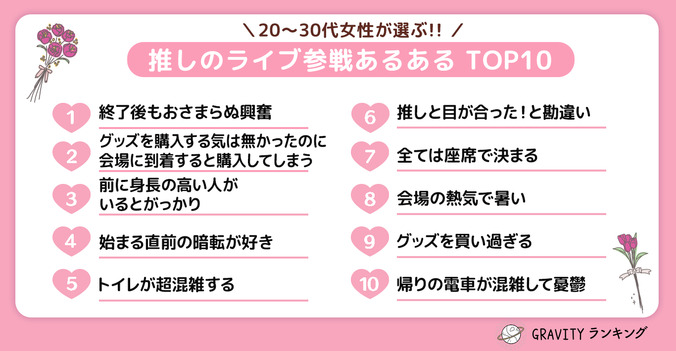 【GRAVITYランキング】20代〜30代女性が選ぶ!!「推しのライブ参戦あるあるTOP10」