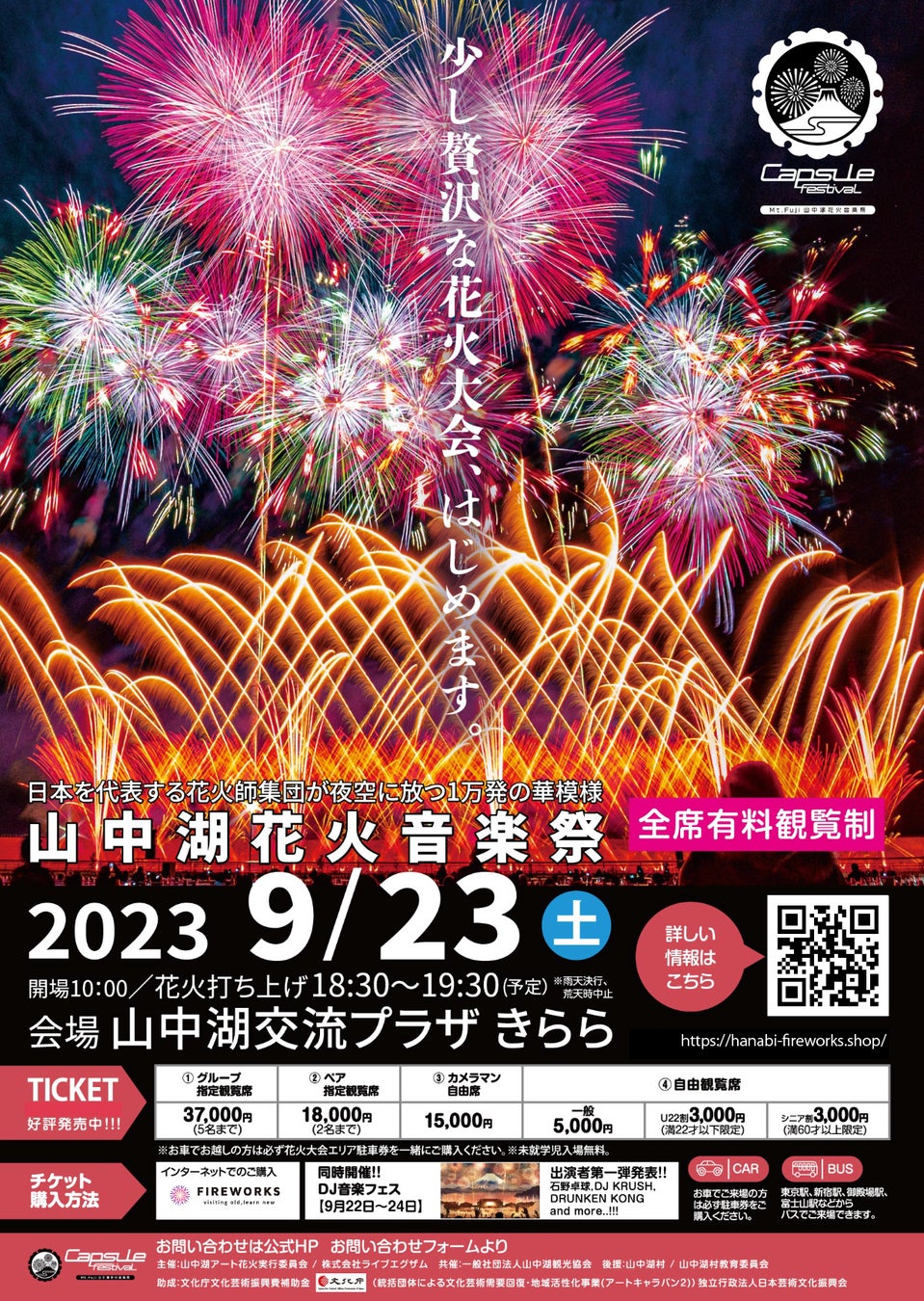 「Capsule - Mt.Fuji 山中湖花火音楽祭 -」は、9月23日(土)に山中湖で開催予定の「伝統」と「カルチャー」を融合した新スタイルの花火大会です。約10,000発の大迫力の花火が富士山と山中湖を背景に打ちあがります。都会ではなかなか見ることができない尺玉(開花時の直径は約320m)が打ちあがることに加え、音楽と花火をシンクロさせたミュージックスターマインを観覧いただけます。職人の想いのこもった花火が、夏の終わりの山中湖の上空と湖面を色鮮やかに彩る予定です。Capsuleでは富士山をバックに花火と風景が一体となった幻想的な打ち上げ花火を目の前でゆったり見られるよう指定席の全てが良席で、全席有料観覧席でご用意しています。山中湖は東京、横浜、山梨県甲府市から車で約90分の立地です。東京駅、新宿駅、御殿場駅、富士山駅などからバスでのご来場も可能です。