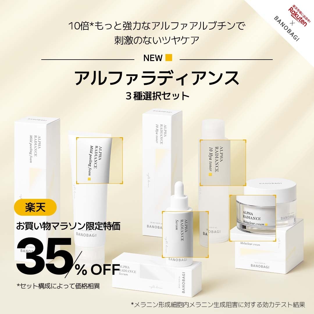 正しいダーマ、バノバギコスメティック(BANOBAGI Cosmetic)で、従来のブランドの人気スキンケアラインだった「アルファラディアンス」ラインの新製品3種(ピーリングフォーム、トナー、クリーム)を新たに発売します。発売を記念して新製品3種のうち「アルファラディアンス10ヒヤトナー」を楽天でのみ10/4(金) 20:00~10/8(火) 23:59までの4日間、なんと50%オフの価格で予約割引イベントを実施します。