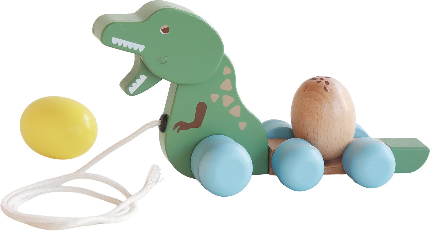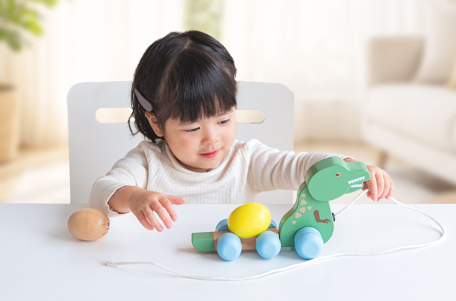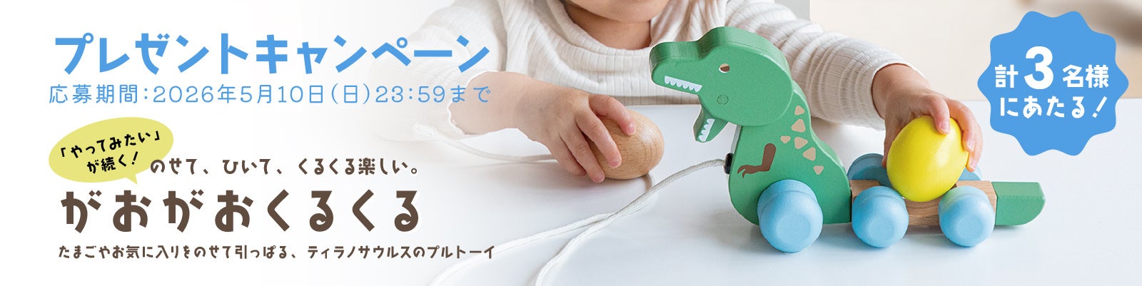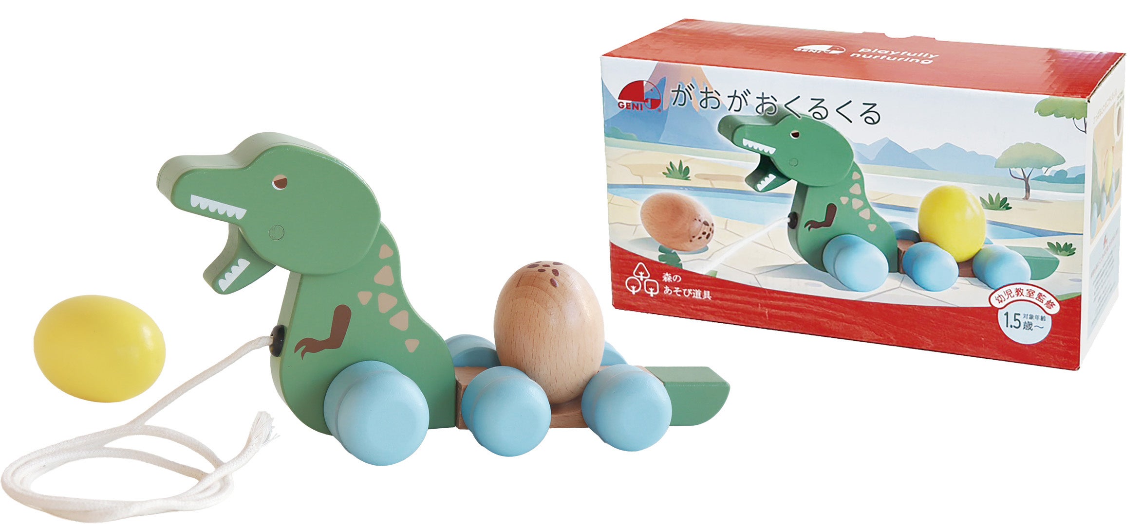 『がおがおくるくる』は、こどもに人気の恐竜・ティラノサウルスをモチーフにした木製のプルトーイです。引っ張ると、背中にのせたたまごがくるくると回りながらついてくる…その不思議な動きが、こどもの視線と興味を引きつけます。