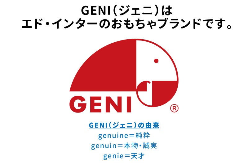 ブランドロゴには、GENIのシンプルで上質なおもちゃが、こどもの持つ天賦の才能を引き出す、という意味を込めています。様々な形に捉えることができ、何の形であるか「正解」がないロゴマークは、こどもの自由な発想を尊重し、豊かな感性を育てるブランドでありたいという想いを表現しています。