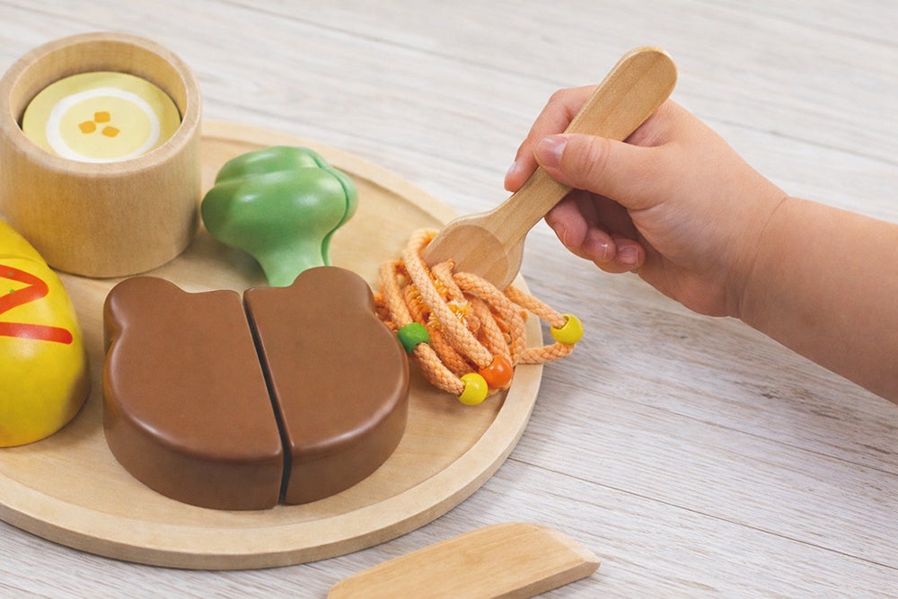ナイフで食材を切るときの手ごたえ、フォークでスパゲッティを巻く動き、カップを持って飲むしぐさなど、日常の食事で見ている動作を、自分の手で再現できることが、こどもにとって大きな満足感と達成感につながります。さらに、「今日はクマさんハンバーグにする?」「スープはどっちにする?」といった“選ぶ楽しさ”があることで、あそびが単調にならず、何度でも繰り返したくなる仕掛けになっています。