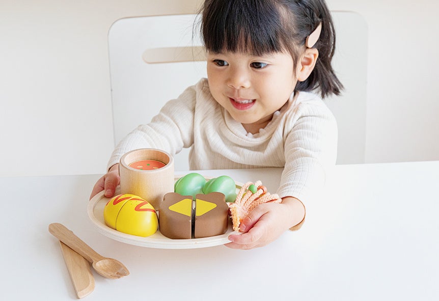 『森のランチプレート』は、こどもたちの「やってみたい」をそのまま形にした、木製のままごとセットです。プレートいっぱいに並んだお子様ランチは、見た瞬間に「これがやりたかった!」と感じるようなワクワク感を引き出します。テーブルに並べて「いらっしゃいませ!」とお店屋さんになりきったり、「どれから食べますか?」とやりとりをしたり。遊び始めたその瞬間から、こども自身が“役割”を持ち、ストーリーをつくり始めます。
